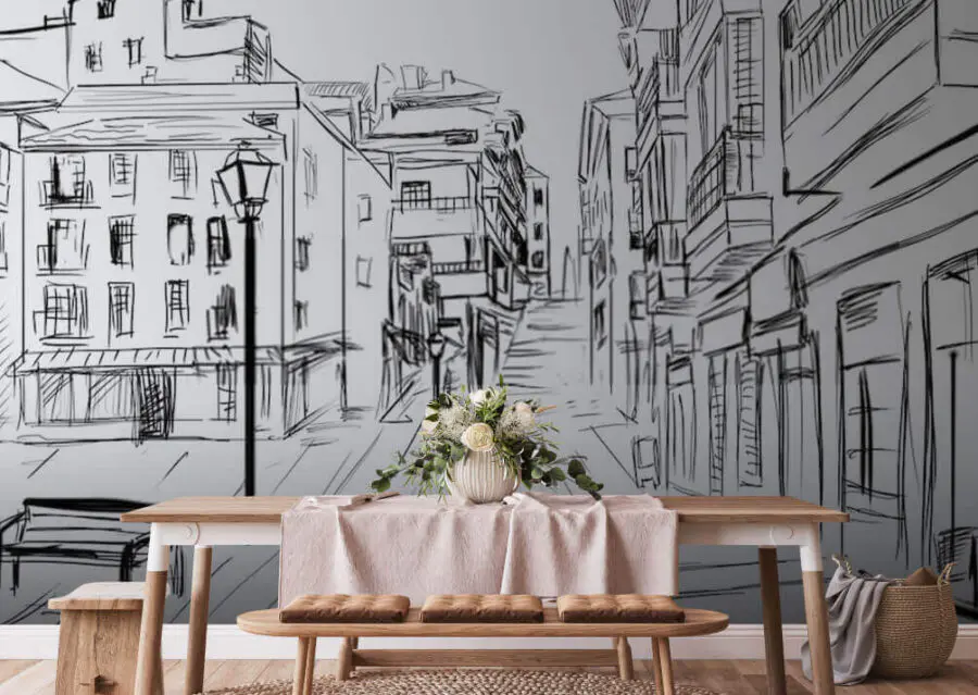 Stellen Sie sich vor, Sie machen es sich in Ihrem Wohnzimmer gemütlich und haben dieses beeindruckende schwarz-weiße Wandbild an Ihrer Wand. Es ist wie eine skurrile Skizze, die zum Leben erwacht! Die verspielten Linien, die eine urbane Szene mit einer einsamen Bank und hoch aufragenden Gebäuden einfangen, bringen ein künstlerisches Flair mit sich, das Sie von europäischen Straßen träumen lässt.