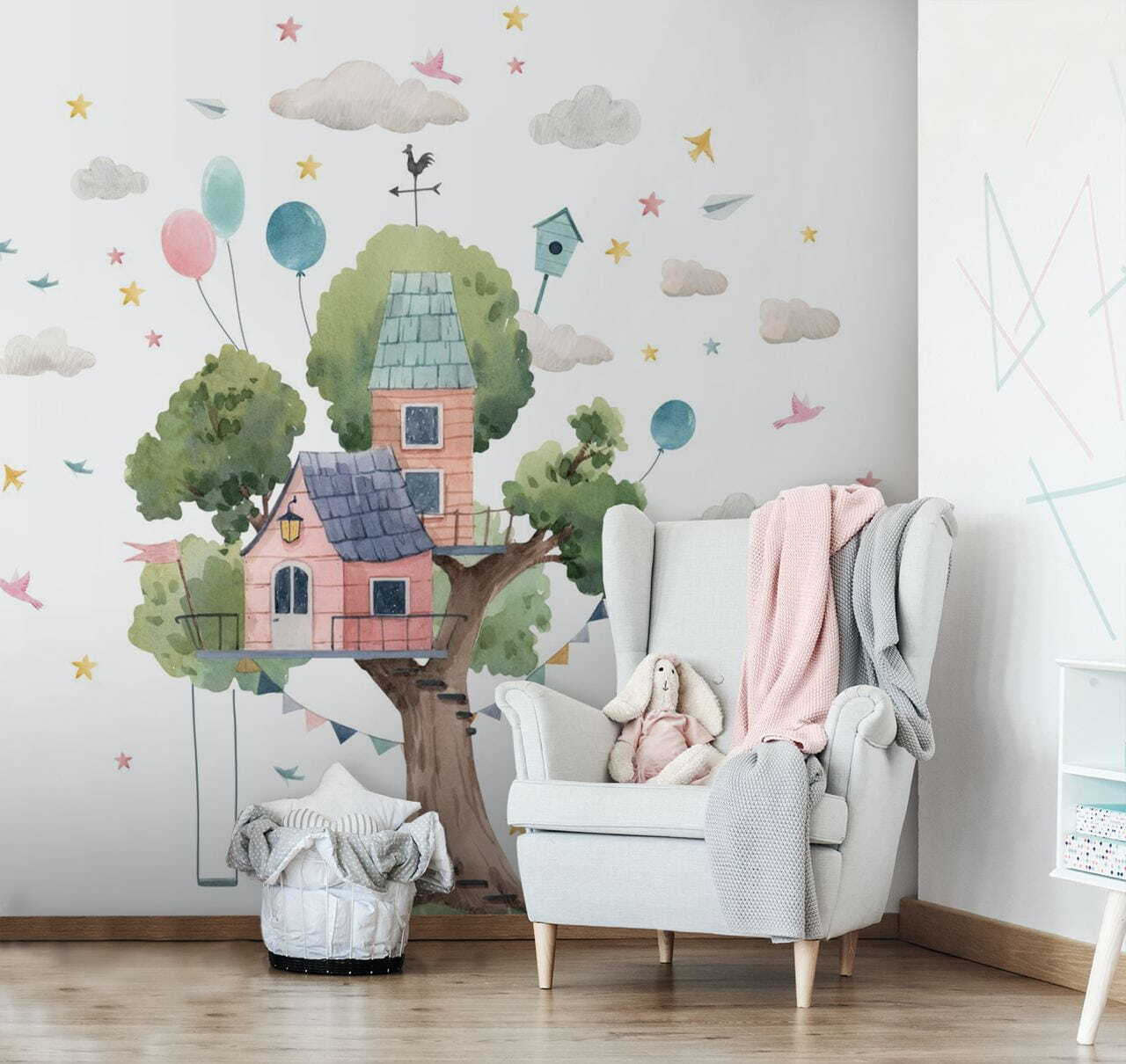 Stellen Sie sich ein skurriles Baumhaus vor, das in einer traumhaften Aquarellwelt schwebt. Diese Wandtapete ist nicht nur ein Bild, sondern eine Einladung zum Abenteuer! Es bringt die Essenz der Kindheit in jeden Raum und ist perfekt, um die Fantasie anzuregen. Die Pastellfarben, verspielten Luftballons und charmanten Vögel versetzen jeden zurück in die unbeschwerten Tage, in denen man auf Bäume geklettert ist und geträumt hat. Stellen Sie sich vor: eine gemütliche Ecke, in der die Fantasie auf Hochtouren läuft und Kinder über imaginäre Teepartys in den Baumwipfeln kichern. Dieses Wandbild könnte leicht zum Mittelpunkt eines magischen Raumes werden und über Jahre hinweg Freude und Staunen bereiten!