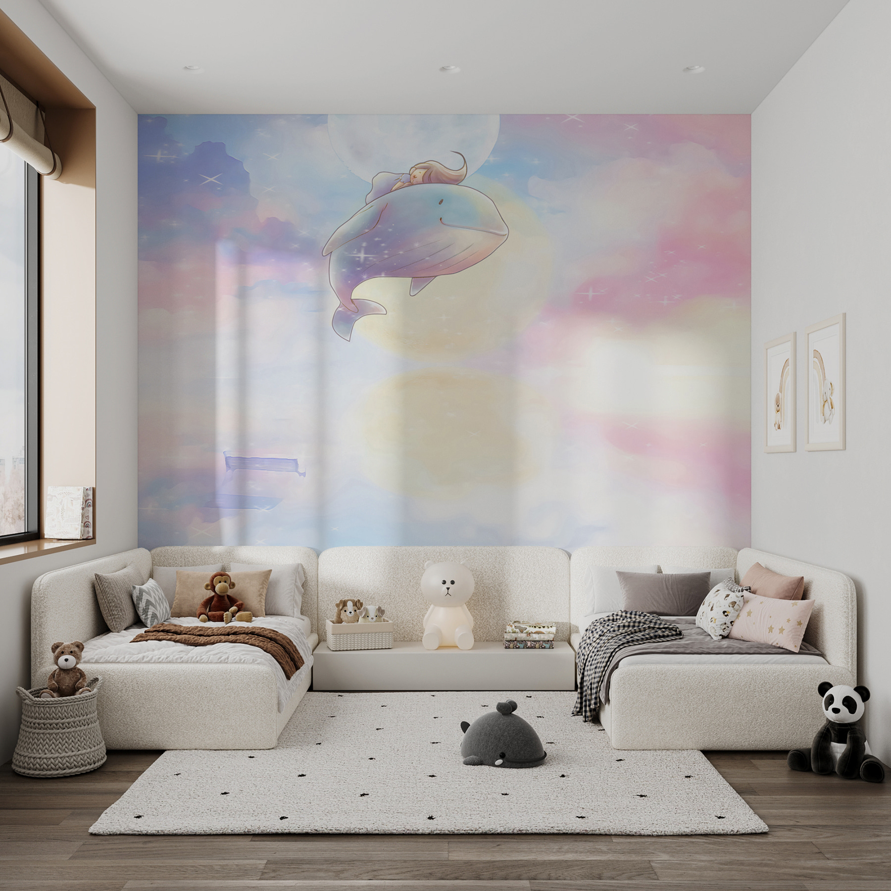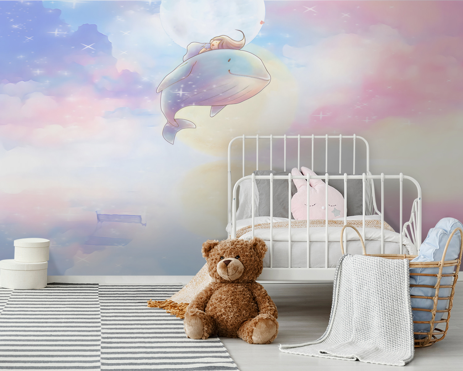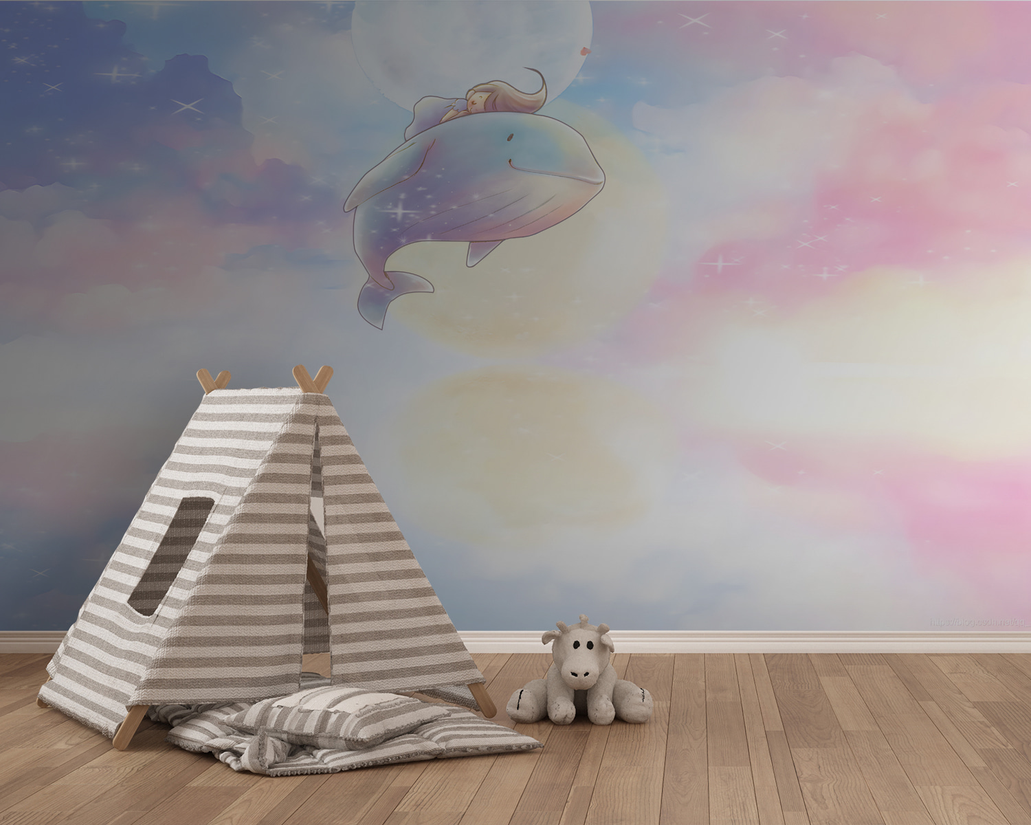 Lernen Sie Ihren neuen besten Freund an der Wand kennen – die Fototapete “Cartoon of a Whale”! Diese verträumte Szene ist wie eine süße kleine Reise in eine magische Welt, in der ein freundlicher Wal Ihr Kind durch flauschige pastellfarbene Wolken begleitet. Perfekt für das Zimmer der Tochter oder jeden kreativen Raum!