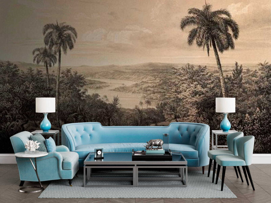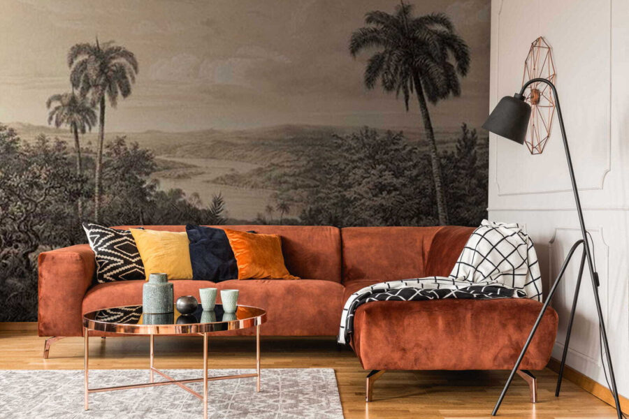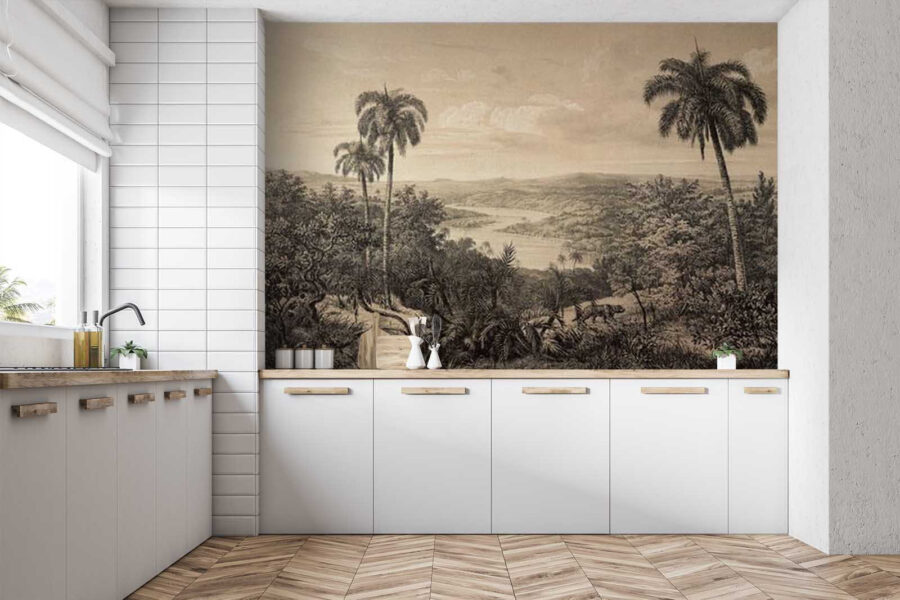 Stellen Sie sich vor, Sie betreten jedes Mal, wenn Sie einen Raum betreten, ein ruhiges Paradies – diese Wandtapete macht das möglich! „Landschaft mit Bäumen und einem Fluss“ fängt mit seinen lebhaften Palmen und dem sich schlängelnden Fluss die Essenz der Natur ein und bietet eine friedliche Flucht aus dem Alltag. Perfekt für eine gemütliche Leseecke oder als Blickfang im Wohnzimmer, lädt sie zu Tagträumen von üppigen Ausflügen ein. Stellen Sie sich vor, Sie trinken Ihren Morgenkaffee und blicken dabei auf das üppige Grün – es ist, als würden Sie ein Stück Natur ins Haus holen. Außerdem sorgen die dezenten Farbtöne für eine ruhige Atmosphäre und bilden einen reizvollen Hintergrund für all Ihre Lieblingsmomente. Was könnte beruhigender sein?