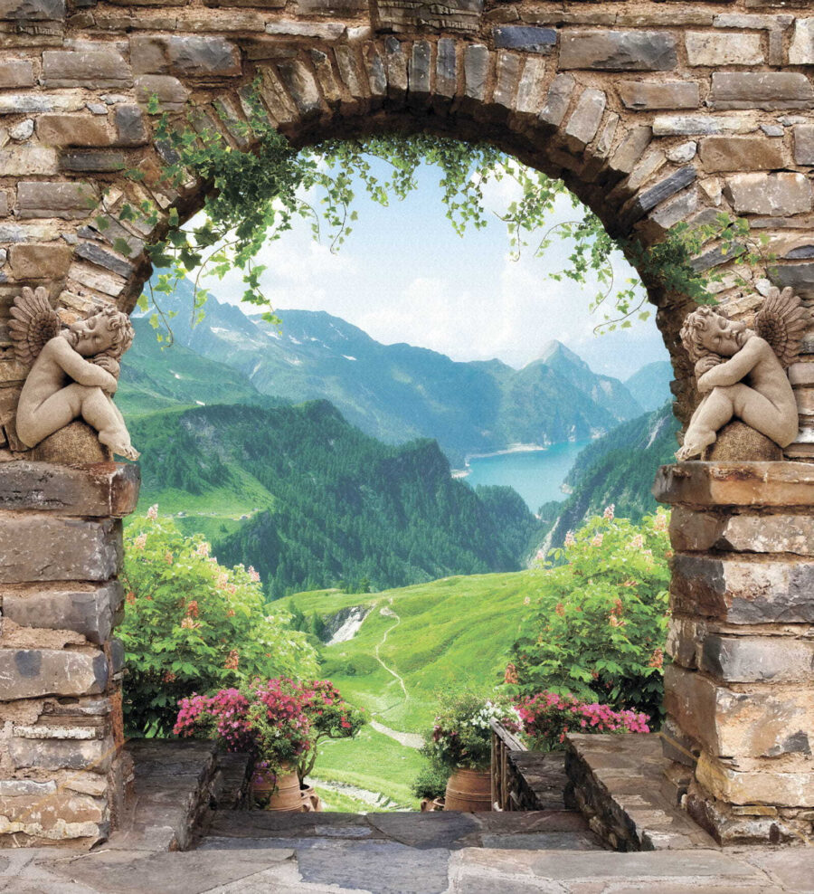Stellen Sie sich vor, Sie treten durch einen rustikalen Steinbogen, der direkt in ein atemberaubendes Tal führt. Diese Wandmalerei ist nicht nur eine Dekoration, sondern weckt jeden Tag ein kleines Abenteuer. Stellen Sie sich vor, Sie schlürfen Ihren Morgenkaffee und blicken dabei auf das üppige Grün und das schimmernde Wasser unter Ihnen. Die verspielten Putten auf beiden Seiten verleihen dem Bild einen Hauch von Laune und lassen es wie eine Szene aus einem Märchen erscheinen. Diese Fototapete eignet sich perfekt für ein Wohnzimmer oder eine gemütliche Ecke und verwandelt jeden Raum in eine verträumte Oase. Es ist, als hätte man ein kleines Stück Natur direkt an der Wand, das mühelos ein Gefühl der Ruhe und des Staunens in den Alltag einlädt. Vergessen Sie nur nicht, die imaginären Pflanzen zu gießen!