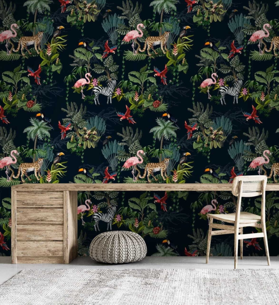 Verwandeln Sie jede Wand in eine lebendige Oase mit diesem atemberaubenden Wandbild, das Flamingos und Zebras inmitten üppiger tropischer Vegetation zeigt. Es ist, als würden Sie ein kleines Stück Wildnis direkt in Ihr Wohnzimmer holen – oder in Ihr Badezimmer, wenn Sie sich trauen! Stellen Sie sich vor, Sie betreten jedes Mal, wenn Sie vorbeigehen, einen üppigen Dschungel. Die satten Farben heben sich von dem dunkleren Hintergrund ab und bilden den perfekten Hintergrund für gemütliche Zusammenkünfte oder Entspannung allein. Außerdem ist es ein toller Gesprächsaufhänger – wer liebt es nicht, über exotische Wildtiere zu plaudern? Diese Wandtapete ist nicht nur Dekoration, sondern ein Erlebnis. Veredeln Sie also Ihre schlichte Wand und lassen Sie die Dschungelstimmung aufkommen!
