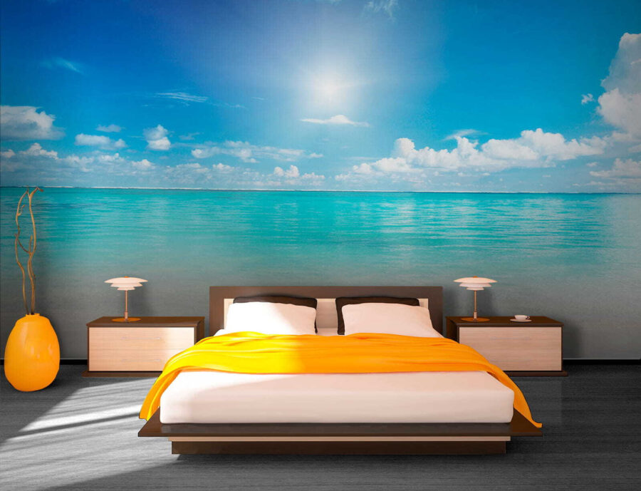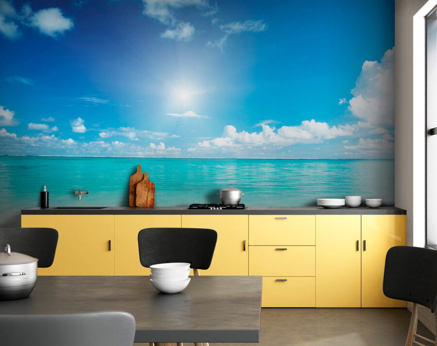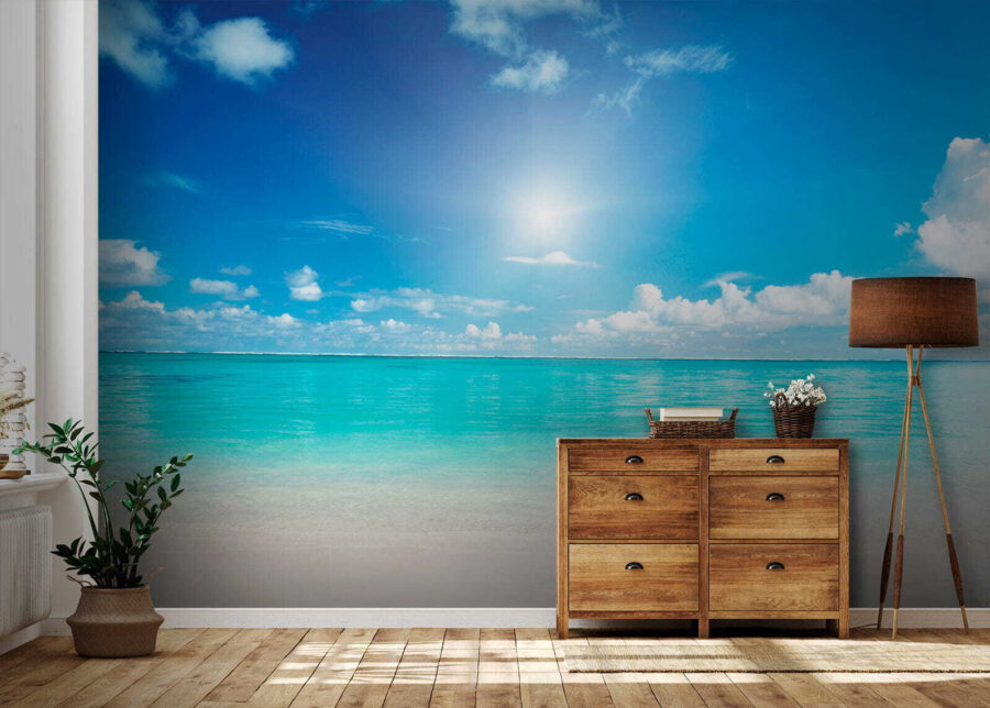 Mit dieser atemberaubenden Fototapete mit blauem Himmel, flauschigen Wolken und einer strahlenden Sonne, die ein warmes Licht ausstrahlt, verwandeln Sie jeden Raum in einen ruhigen Rückzugsort. Stellen Sie sich vor, Sie betreten Ihren Raum und haben das Gefühl, einen friedlichen Strand betreten zu haben – auch wenn es sich nur um Ihr Wohnzimmer handelt. Diese Fototapete fängt die Essenz des Küstengefühls ein und lädt zu Ruhe und Entspannung ein. Es eignet sich perfekt zum Träumen oder für die Planung Ihres nächsten Urlaubs am Meer und bringt mühelos ein Stück Natur ins Haus. Wer würde nicht gerne mit einem Blick aufwachen, der nur aus Sonnenschein und sanften Wellen besteht? Es ist wie ein Urlaub für Ihre Wände!