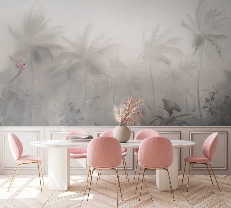 Verwandeln Sie jeden Raum in eine traumhafte Oase mit dieser bezaubernden Wandtapete – „Nebelwald mit Palmen und Schmetterlingen“. Es ist, als würde man jedes Mal, wenn man daran vorbeigeht, einen ruhigen tropischen Rückzugsort betreten. Die zarten, umherflatternden Kreaturen verleihen dem Ganzen einen Hauch von Fantasie und lassen Sie sich ein wenig wie in einem Märchen fühlen. Die sanften, nebligen Farbtöne sorgen für eine ruhige Atmosphäre, die perfekt zum Tagträumen oder für gemütliche Gespräche bei einer Tasse Kaffee ist. Stellen Sie sich diese Tapete hinter einem weichen Sessel vor, der Ihren Lesebereich in eine persönliche Oase verwandelt. Wer würde sich hier nicht entspannt fühlen? Diese Tapete ist Ihre Eintrittskarte zu einer unbeschwerten Inselatmosphäre, ohne dass Sie Sonnencreme benötigen!