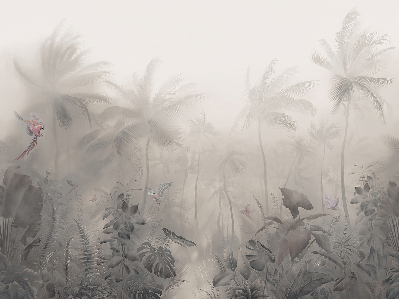 Fototapeten Nebliger Wald mit Palmen und Schmetterlingen Fototapeten Nebliger Wald mit Palmen und Schmetterlingen