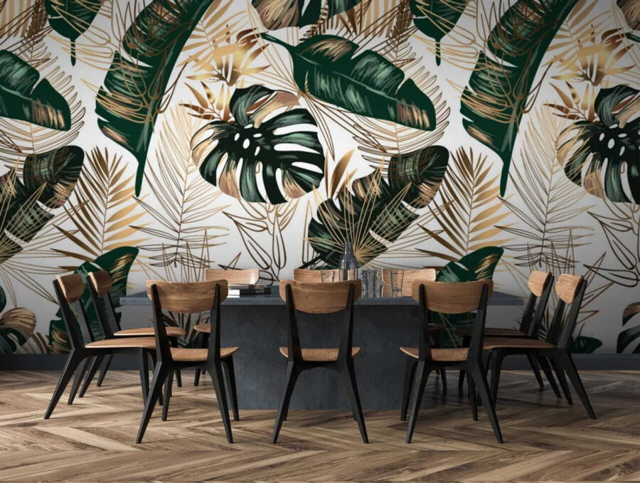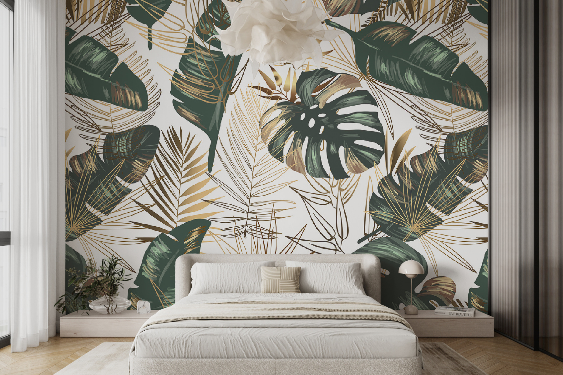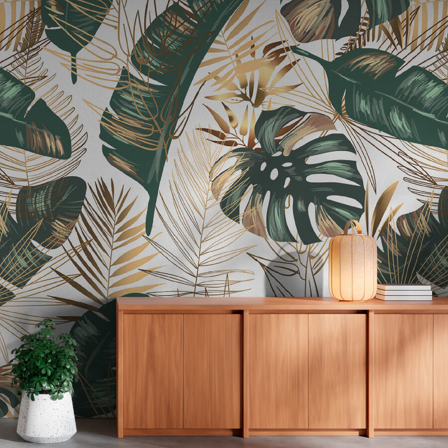 Verwandeln Sie jeden Raum in ein tropisches Paradies mit diesen lebhaften Wandbildern, die üppige Blätter und verspielte abstrakte Muster zeigen. Stellen Sie sich vor, Sie betreten Ihr Wohnzimmer und fühlen sich wie auf einer Insel gelandet – diese Grün- und Goldtöne laden einfach zum Entspannen ein. Egal, ob es sich um eine gemütliche Leseecke oder einen lebhaften Raum für ein Treffen mit Freunden handelt, diese Fototapete verleiht dem Raum den perfekten Touch von Persönlichkeit. Es ist wie eine sanfte Erinnerung daran, das Tempo zu drosseln und die Schönheit der Umgebung in sich aufzunehmen. Wer würde nicht gerne an einem Getränk nippen und so tun, als wäre er im Urlaub, direkt zu Hause?