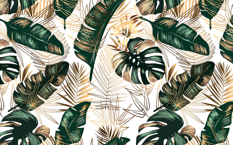 Verwandeln Sie jeden Raum in ein tropisches Paradies mit diesen lebhaften Wandbildern, die üppige Blätter und verspielte abstrakte Muster zeigen. Stellen Sie sich vor, Sie betreten Ihr Wohnzimmer und fühlen sich wie auf einer Insel gelandet – diese Grün- und Goldtöne laden einfach zum Entspannen ein. Egal, ob es sich um eine gemütliche Leseecke oder einen lebhaften Raum für ein Treffen mit Freunden handelt, diese Fototapete verleiht dem Raum den perfekten Touch von Persönlichkeit. Es ist wie eine sanfte Erinnerung daran, das Tempo zu drosseln und die Schönheit der Umgebung in sich aufzunehmen. Wer würde nicht gerne an einem Getränk nippen und so tun, als wäre er im Urlaub, direkt zu Hause?