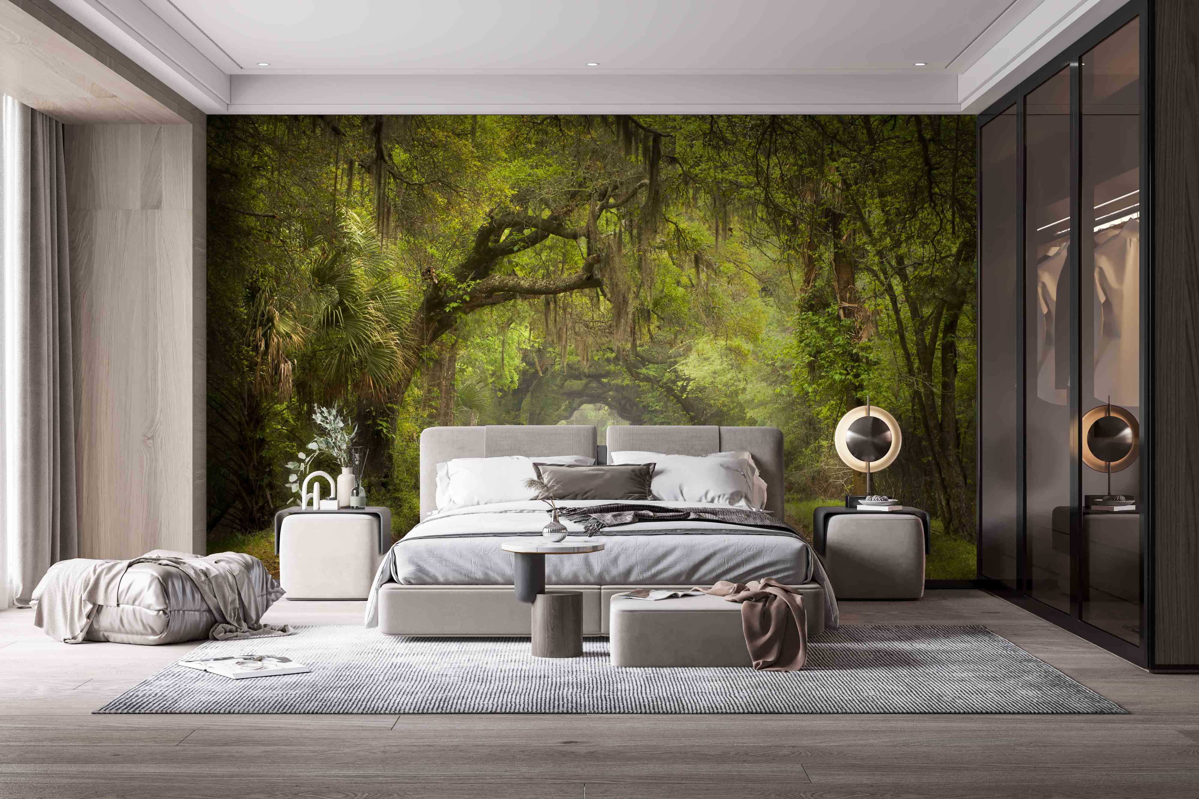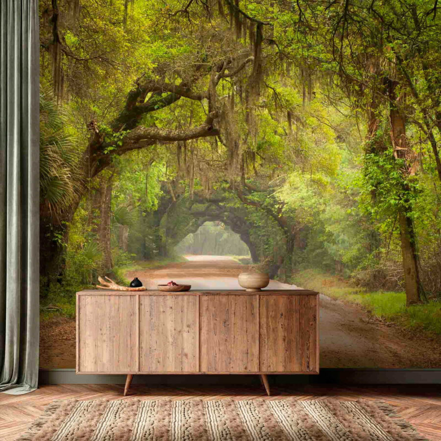 Stellen Sie sich vor, Sie betreten an einem sonnigen Tag einen Feldweg, über dem Bäume tanzen, die mit einem weichen, grünen Schleier aus Moos bedeckt sind. Dieses Wandbild ist nicht nur eine Wanddekoration – es ist eine Flucht, ein kleines Stück Natur direkt in Ihrem Wohnzimmer. Es lädt zu Tagträumen ein, auf diesem Weg zu wandern, vielleicht einem neugierigen Reh zu begegnen oder einfach nur eine sanfte Brise zu spüren. Perfekt für diejenigen, die die Natur lieben, aber nicht bereit sind, ihr gemütliches Zuhause aufzugeben. Verleihen Sie jedem Raum einen Hauch von Wärme und Abenteuer, und schon fühlt sich jeder Blick wie ein kleiner Urlaub an. Wer würde sich nicht einen Platz in der ersten Reihe für eine so friedliche Aussicht wünschen?