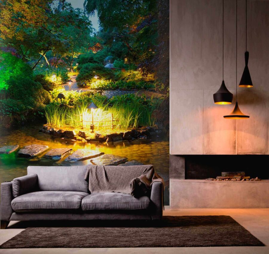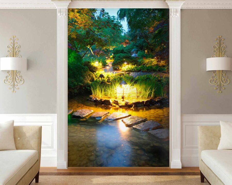 Verwandeln Sie jeden Raum mit dem bezaubernden Wandbild „Steinweg in einem Teich mit Lichtern“. Stellen Sie sich vor, Sie betreten direkt von Ihrem Wohnzimmer aus eine Oase der Ruhe! Dieses Wandbild hüllt Sie in beruhigende Farbtöne und sanft schimmernde Lichter und vermittelt Ihnen das Gefühl, in der Abenddämmerung durch einen versteckten Garten zu schlendern.