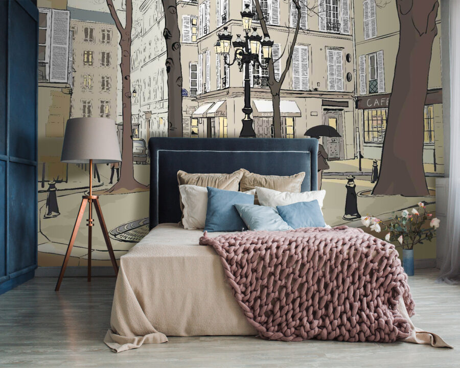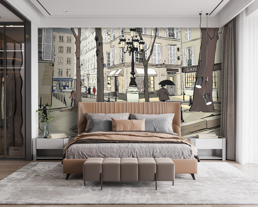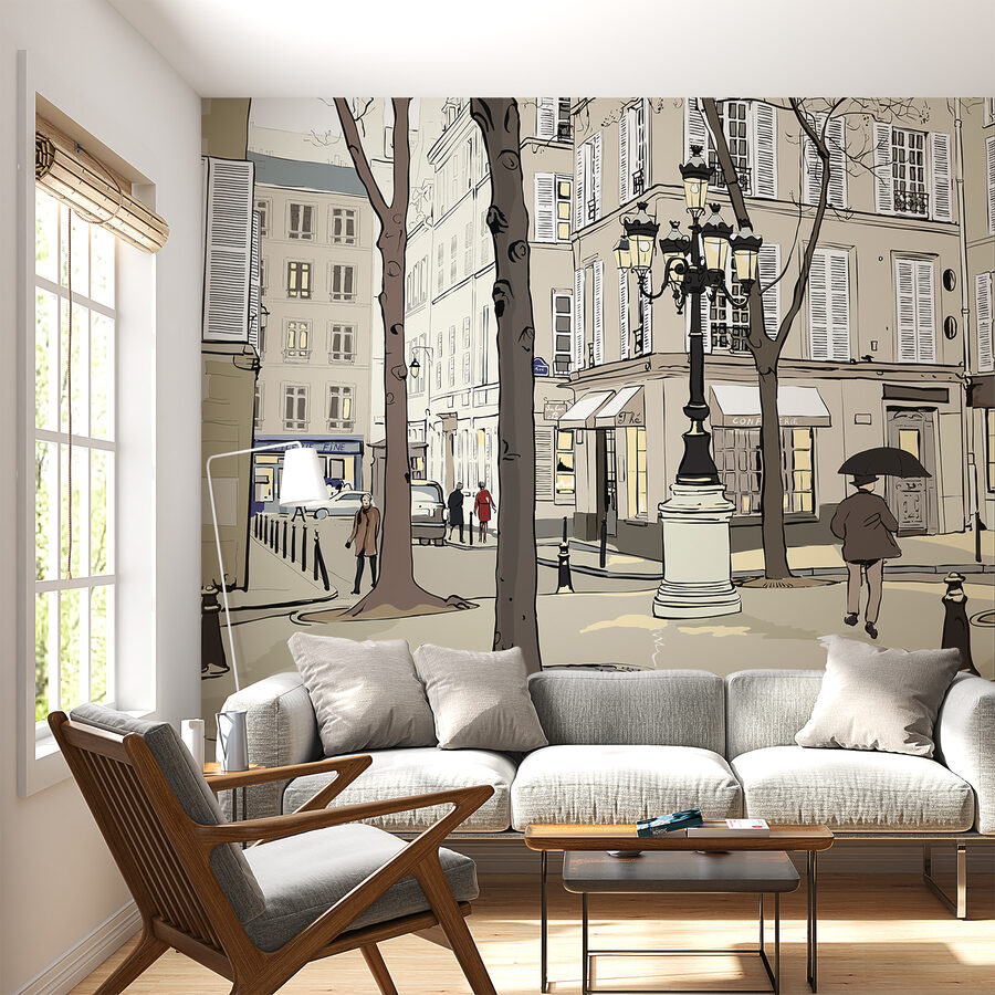 Verwandeln Sie eine schlichte Wand in eine lebendige Szene mit diesem skurrilen Wandbild, das die Essenz des Stadtlebens einfängt. Stellen Sie sich vor, Sie schlendern eine bezaubernde Straße entlang, flankiert von hohen Bäumen und malerischen Cafés, wo jeder Blick etwas Reizvolles offenbart. Die weiche Farbpalette sorgt für eine gemütliche Atmosphäre und eignet sich perfekt für ein Wohnzimmer oder einen kreativen Raum. Stellen Sie sich den Morgenkaffee vor dieser Kulisse vor, oder eine verspielte Atmosphäre in einem Kinderzimmer. Es ist, als würde man ein Stückchen Stadt in sein Zuhause einladen – skurril, herzerwärmend und voller Geschichten. Es ist mehr als nur ein Wandbild, es ist eine Erfahrung, die sich mit jedem gemeinsamen Moment entfaltet.