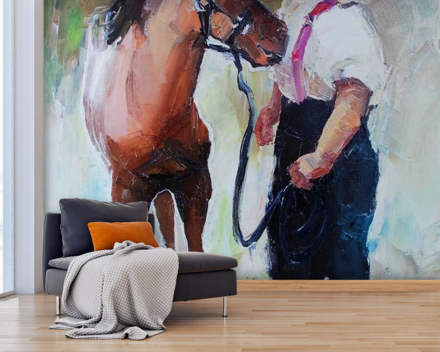 Wir präsentieren Ihnen ein Wandbild, das pure Magie einfängt – ein Mädchen, das ihrem Pferd einen zärtlichen Kuss gibt. Dieses Kunstwerk ist nicht nur Farbe auf einer Wand, sondern ein Fenster in eine Welt, in der Unschuld und Freundschaft inmitten sanfter Pinselstriche erblühen. Stellen Sie sich vor, Sie betreten diesen Raum und fühlen sich sofort beschwingt, wie durch eine warme Umarmung an einem kalten Tag. Die erdigen Farben verschmelzen harmonisch miteinander und wecken ein Gefühl von Frieden und Nostalgie. Es ist perfekt, um ein Spielzimmer aufzuhellen, einer gemütlichen Ecke Charme zu verleihen oder in jedem Raum Freude zu wecken. Eine reizvolle Erinnerung daran, dass Liebe keine Grenzen kennt, nicht einmal zwischen den Arten! Ob Sie nun ein Pferdeliebhaber sind oder einfach nur jemand, der einzigartige Dekorationen schätzt, dieses Wandbild singt eine süße Melodie, die das Herz berührt. Wer würde sich nicht jeden Tag in dieser Wärme sonnen wollen?