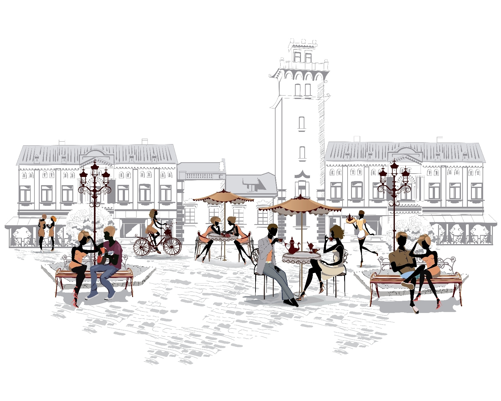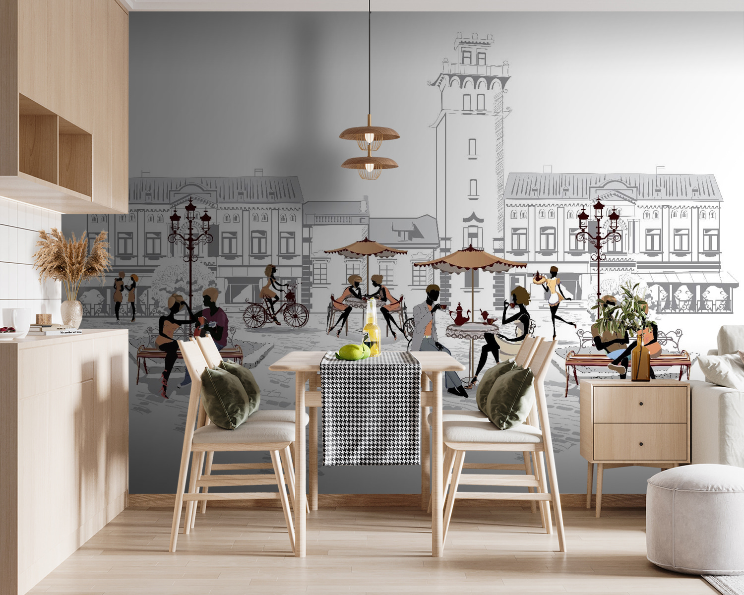 Stellen Sie sich vor: eine charmante Straßenszene, die ein Stück Leben direkt in Ihr Zuhause bringt. Diese Fototapete fängt einen sonnigen Tag ein, an dem ein Mann und eine Frau auf einer gemütlichen Bank sitzen, umgeben vom geschäftigen Treiben in einem Café. Stellen Sie sich das Klirren von Kaffeetassen, das Lachen von Freunden und eine sanfte Brise vor, die vorbei weht. Das Bild ist perfekt für alle, die das Stadtleben lieben oder sich einfach nur in einen ruhigen Moment zurückziehen wollen. Dieses Werk wärmt nicht nur einen Raum, sondern lädt auch dazu ein, Geschichten und Erinnerungen auszutauschen und Gespräche zu führen, wie sie auf dem Wandbild stattfinden. Definitiv ein Gesprächsanlass!