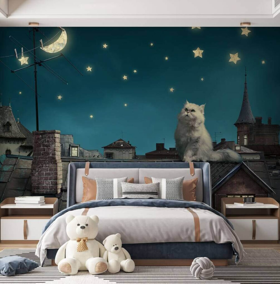 Hier ist ein Wandgemälde, das Sie von Dächern und Sternenhimmel träumen lässt. “Die Katze blickt in den Nachthimmel” ist wie aus einer wunderlichen Gutenachtgeschichte. Stellen Sie sich diese Szene in Ihrem Wohnzimmer oder in einem Kinderzimmer vor – so zauberhaft! Der verträumte Blick der Katze in den Sternenhimmel ist pure Verzauberung, eine friedliche Flucht aus der Hektik des Alltags. Kinder werden von der verspielten Atmosphäre begeistert sein, Erwachsene von der beruhigenden Ästhetik. Es ist eine Mischung aus abstraktem Charme und kindlichem Staunen, die die Fantasie anregt. Und wer könnte schon dieser niedlichen, flauschigen Katze widerstehen, die neugierig in die Nacht blickt?