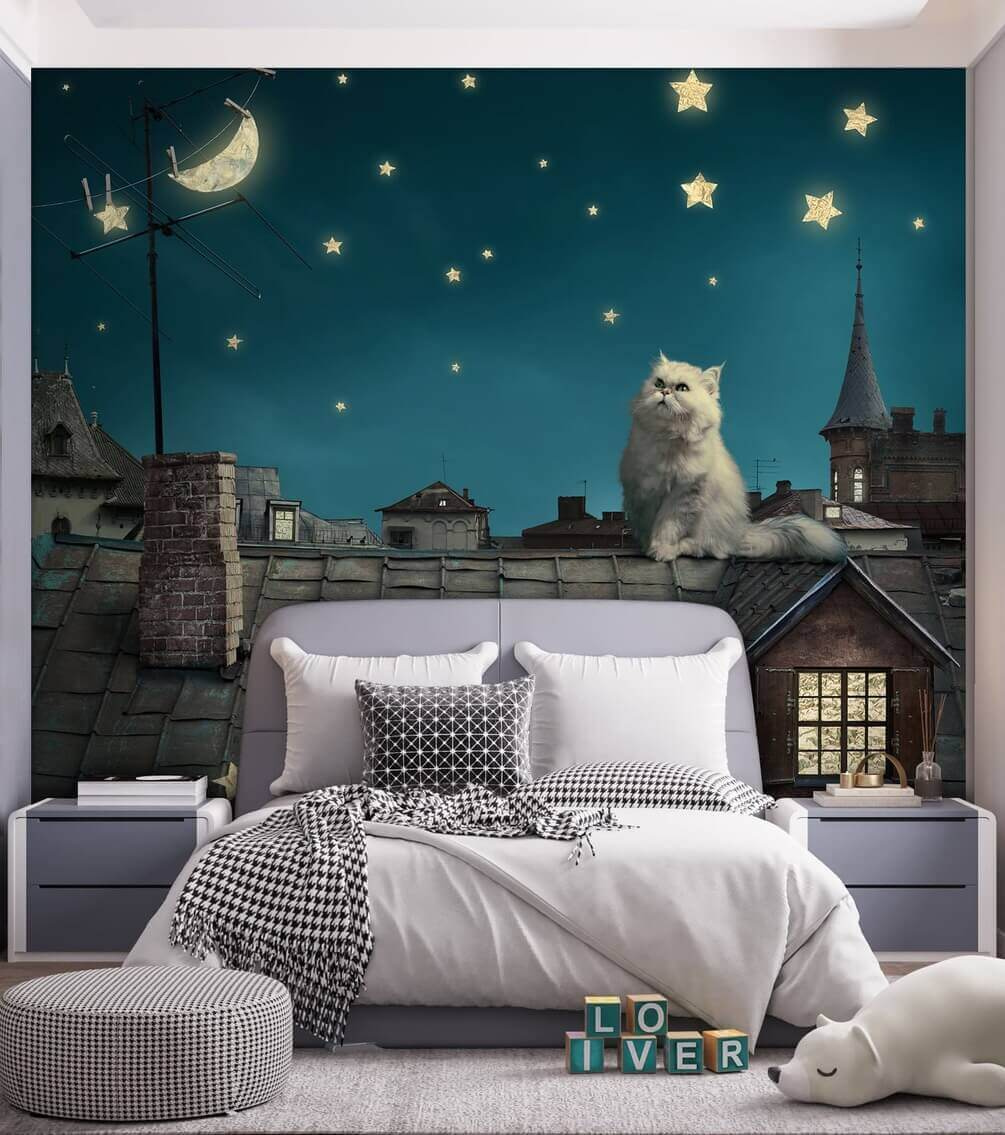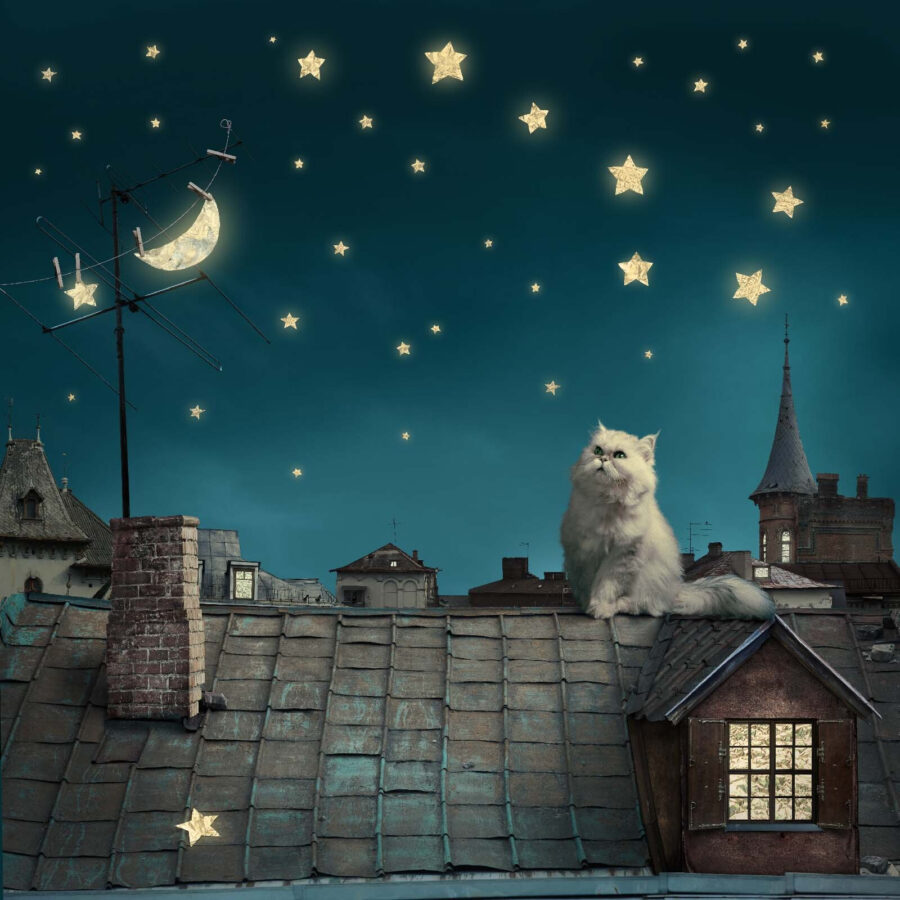 Hier ist ein Wandgemälde, das Sie von Dächern und Sternenhimmel träumen lässt. “Die Katze blickt in den Nachthimmel” ist wie aus einer wunderlichen Gutenachtgeschichte. Stellen Sie sich diese Szene in Ihrem Wohnzimmer oder in einem Kinderzimmer vor – so zauberhaft! Der verträumte Blick der Katze in den Sternenhimmel ist pure Verzauberung, eine friedliche Flucht aus der Hektik des Alltags. Kinder werden von der verspielten Atmosphäre begeistert sein, Erwachsene von der beruhigenden Ästhetik. Es ist eine Mischung aus abstraktem Charme und kindlichem Staunen, die die Fantasie anregt. Und wer könnte schon dieser niedlichen, flauschigen Katze widerstehen, die neugierig in die Nacht blickt?