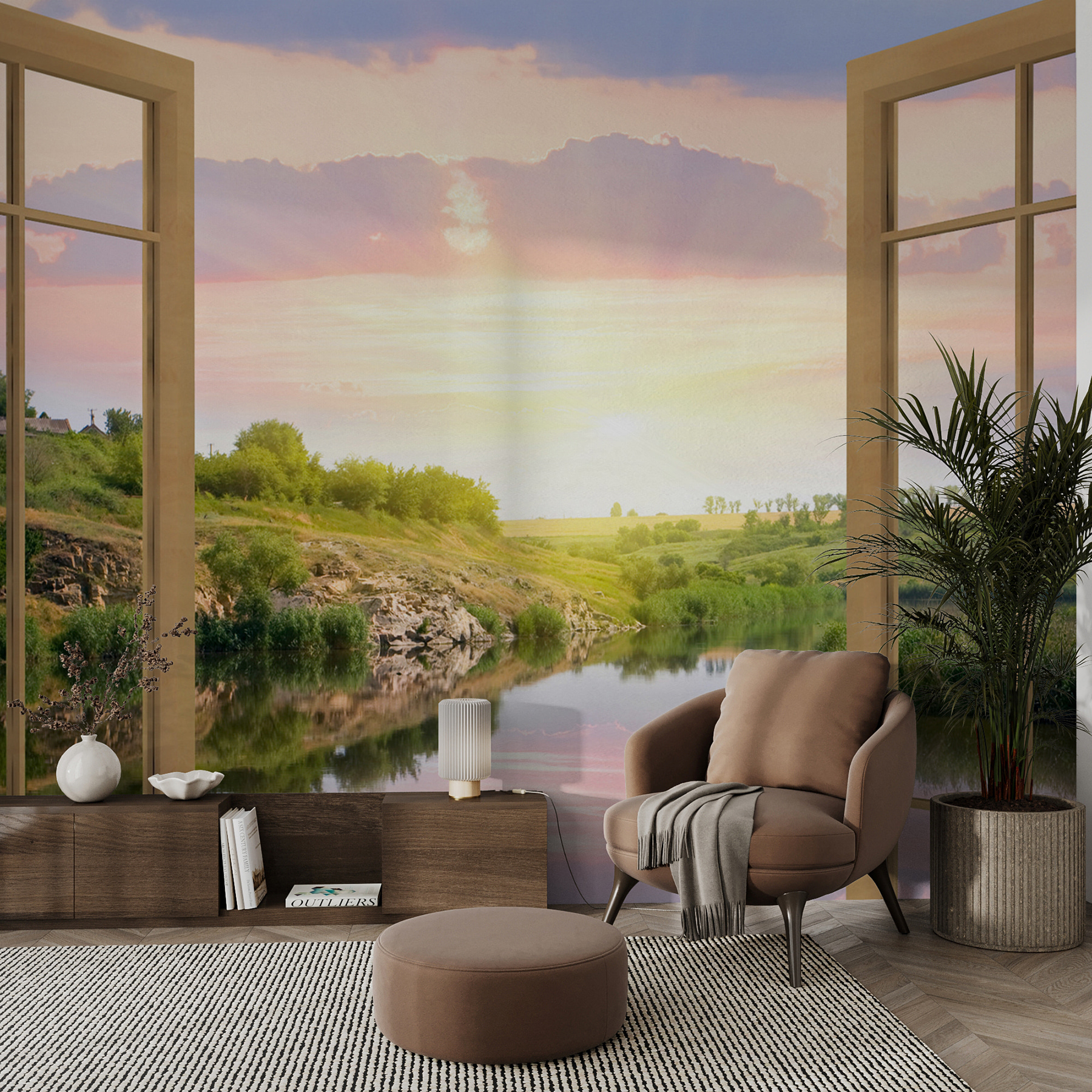 Haben Sie jemals davon geträumt, ein magisches Portal in Ihrem Haus zu haben? Diese Fototapete “Blick auf einen Fluss aus dem Fenster” ist praktisch eines. Stellen Sie sich vor, Sie wachen jeden Tag mit dieser atemberaubenden Szene auf – ein friedlicher Fluss, der durch üppiges Grün fließt, und ein Himmel in sanften Pastelltönen. Es ist, als würde man der Natur entfliehen, ohne die Couch zu verlassen. Perfekt für alle, die sich nach einem langen Tag nach ein wenig Ruhe sehnen. Ihr Raum wird sich offener anfühlen, als hätten Sie ein zusätzliches Fenster mit einer immer wieder bezaubernden Aussicht eingebaut. Und mal ehrlich, wer würde sich diese ruhige, entspannte Atmosphäre nicht wünschen? Ideal für jeden Raum – Wohnzimmer, Schlafzimmer, Büro – was immer Sie wollen!