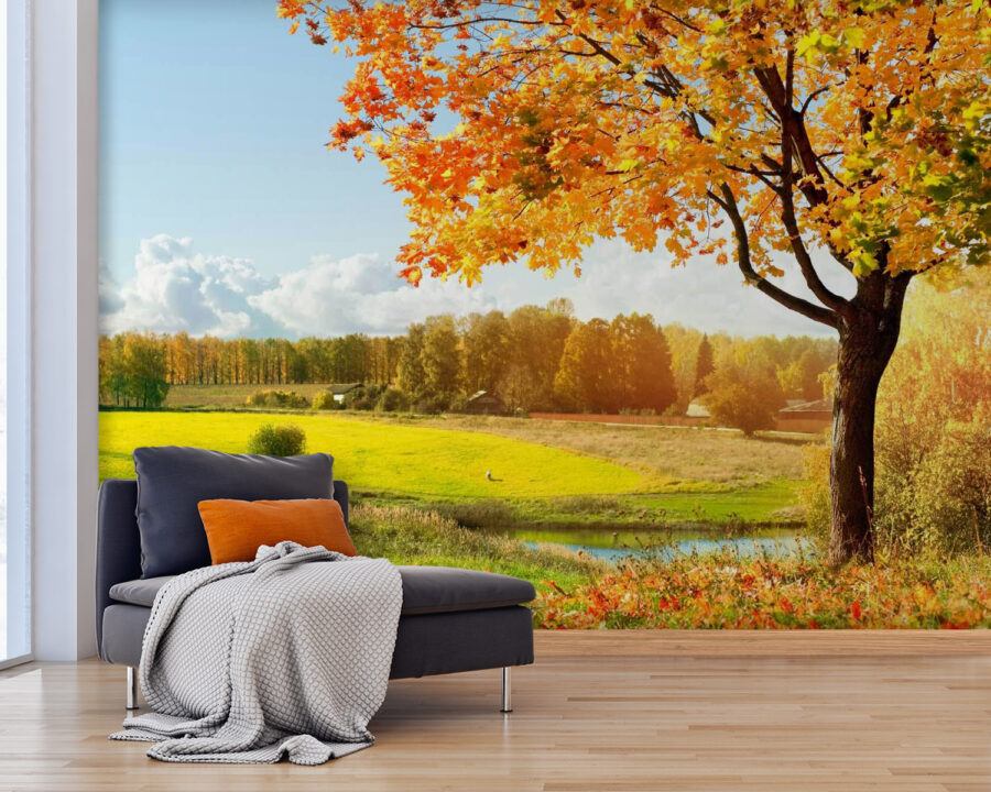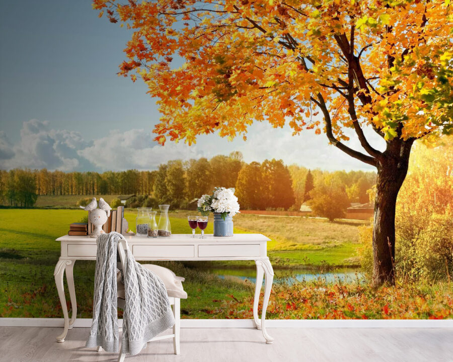 Stellen Sie sich vor, Sie betreten einen Raum und werden von dem leuchtenden Orange der Blätter vor dem strahlend blauen Himmel begrüßt. Genau das vermittelt diese Wandtapete „Baum mit orangefarbenen Blättern auf einem Feld“! Es ist wie ein Hauch frischer Luft jeden Tag. Stellen Sie sich gemütliche Morgenstunden vor, in denen Sie Ihren Kaffee trinken und Ihren Blick auf dieses atemberaubende Kunstwerk richten, das die Schönheit der Natur einfängt. Es könnte Sie zu spontanen Tagträumen über entspannte Herbstnachmittage oder Familienpicknicks inspirieren. Perfekt, um einen langweiligen Raum in etwas Lebendiges und Warmes zu verwandeln. Außerdem wird es sicherlich zu bunten Gesprächen anregen – wer liebt nicht ein gutes Gespräch über die Natur? Bringen Sie Schwung in Ihren Raum!