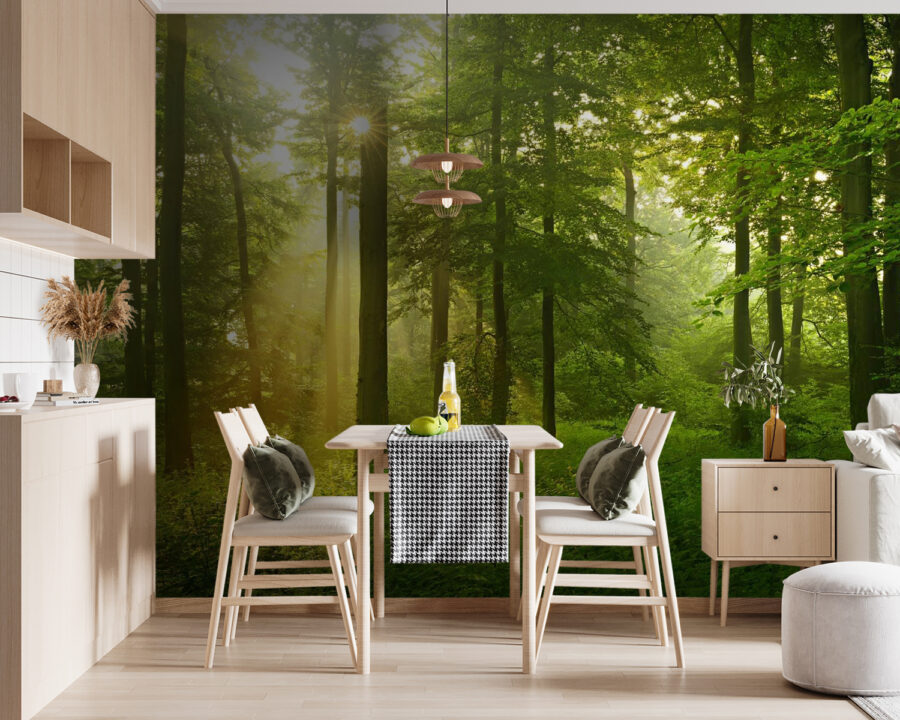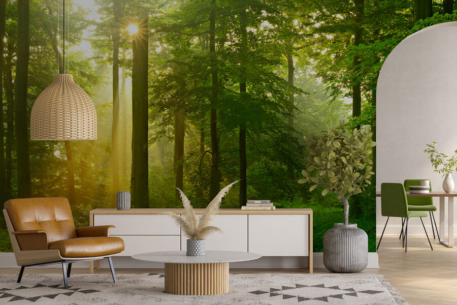 Verwandeln Sie Ihren Raum mit dieser bezaubernden Fototapete, die die Ruhe eines sonnenbeschienenen Waldes direkt in Ihr Zuhause bringt. Stellen Sie sich vor, wie die sanften Strahlen durch die üppigen grünen Blätter fallen und eine warme, einladende Atmosphäre schaffen, die Ihnen das Gefühl gibt, in die Natur eingetreten zu sein. Dieses Stück bringt nicht nur Farbe ins Spiel, sondern haucht dem Raum Leben ein und weckt Tagträume von Waldwanderungen.