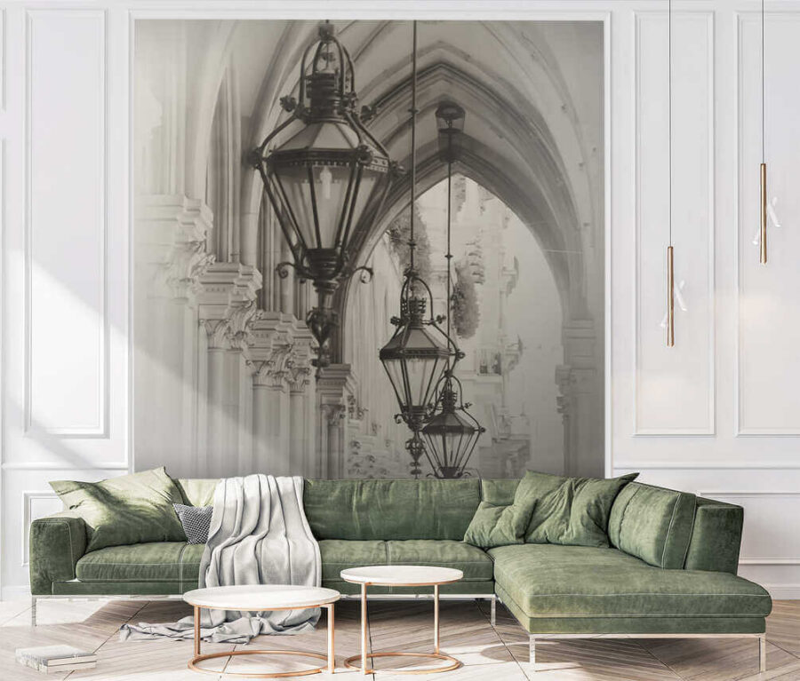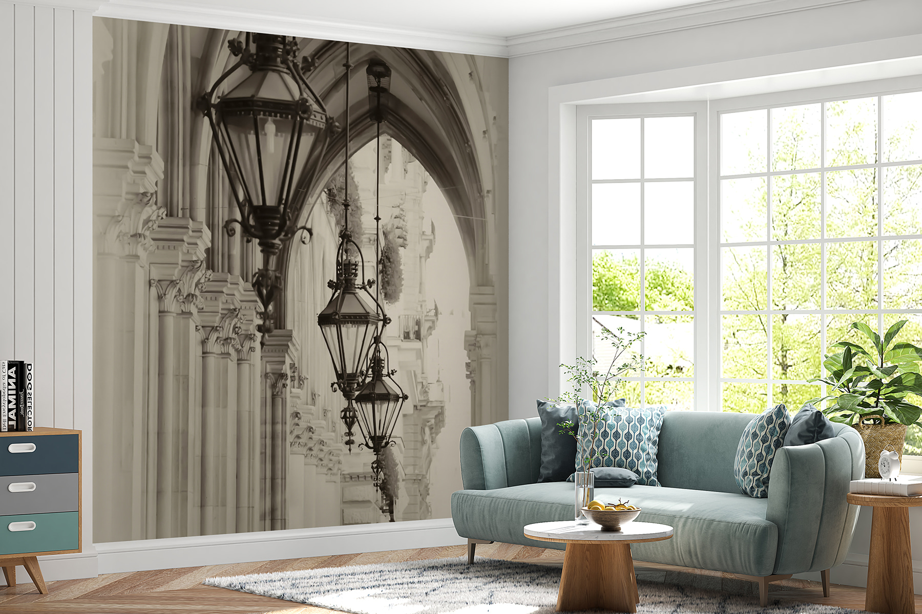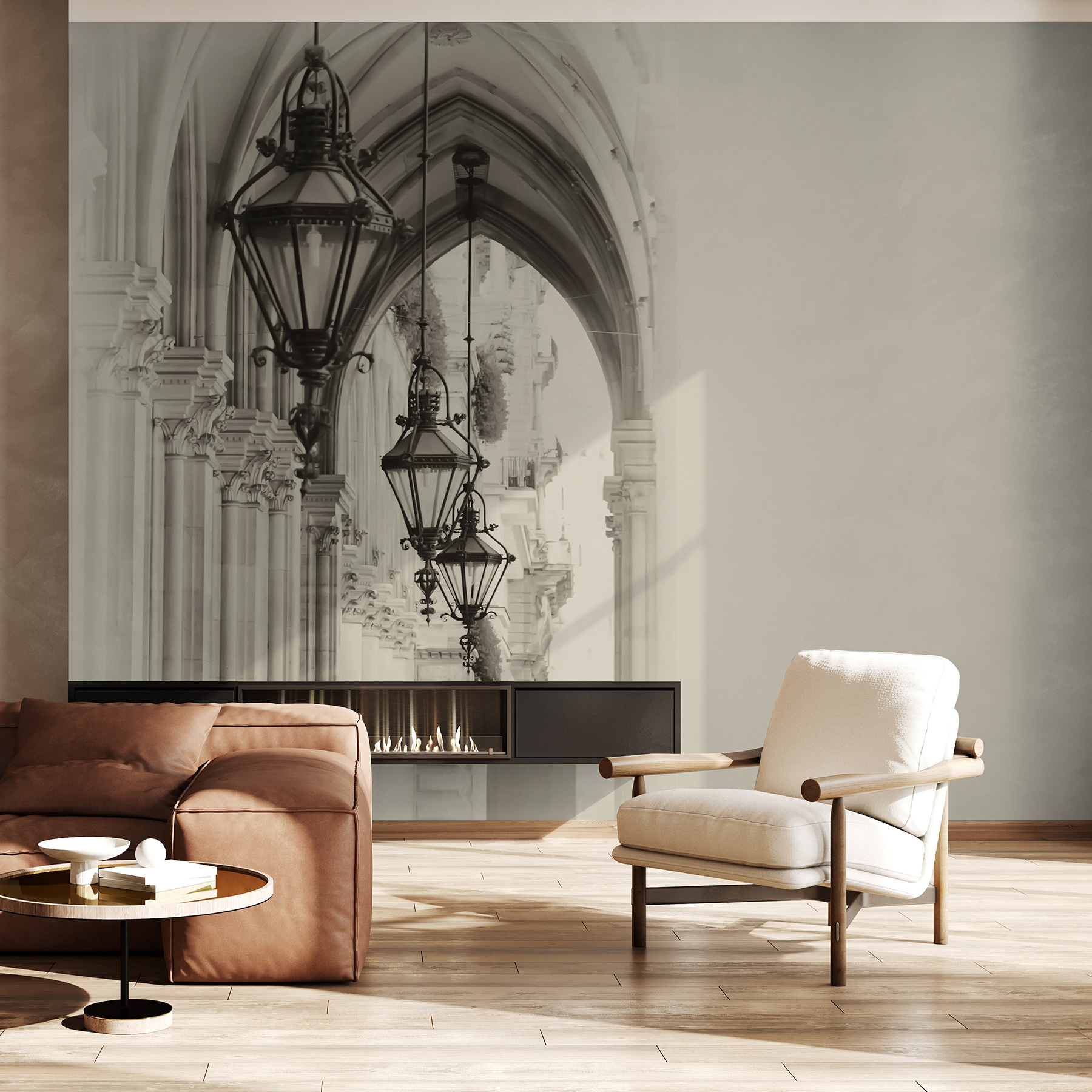 Stellen Sie sich vor, Sie betreten einen Raum und werden sofort in einen prächtigen Flur der alten Welt entführt, wie in einer klassischen europäischen Stadt. Das ist der Zauber dieses “Wandbildes Schwarzes Objekt in einem Raum”. Diese Laternen, die in perfekten Reihen hängen? Sie sind wie Wächter, die die Geschichte bewachen. Man kann fast den kühlen Stein unter den Füßen spüren und die leisen Straßengeräusche hören, die durch die Bögen hallen. Es ist, als hätte man ein geheimes Tor zur Vergangenheit direkt in seinem Wohnzimmer. Die schwarz-weiße Ästhetik sorgt für eine zeitlose, fast verträumte Atmosphäre. Sie ist perfekt, um einen Hauch von architektonischer Eleganz zu vermitteln, ohne den Raum zu überladen. Außerdem ist es ein toller Gesprächsanlass. Wenn Wände sprechen könnten, hätte diese Wand einige erstaunliche Geschichten zu erzählen. Die Mischung aus 3D-Tiefe und Vintage-Charme lässt Räume nicht nur größer aussehen, sondern auch faszinierender wirken – als hätten Sie eine urbane Schatztruhe geöffnet. Perfekt für Tagträumer und alle, die ihren Wänden etwas Seele einhauchen wollen.