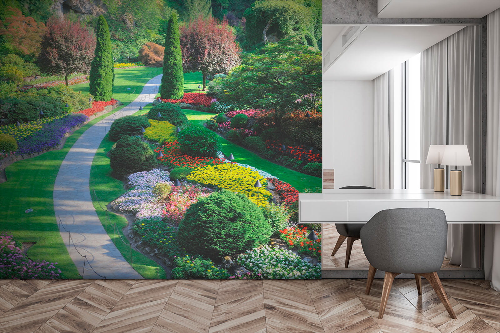Transform your space into a vibrant escape with this stunning wall mural that captures a garden bursting with color. Imagine walking through a winding path flanked by blooming flowers and lush greenery—it’s like bringing the outdoors in! Perfect for brightening up a dull wall or creating a peaceful nook, this mural invites daydreams of sunny days and butterflies flitting about. Feel that calm wash over you as you sip your morning coffee while surrounded by nature’s beauty, minus the pesky bugs, of course. A touch of charm, a splash of joy—what’s not to love?