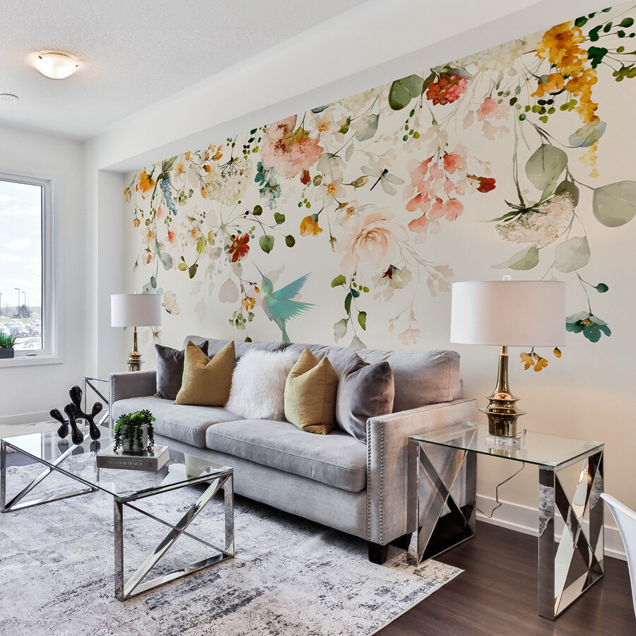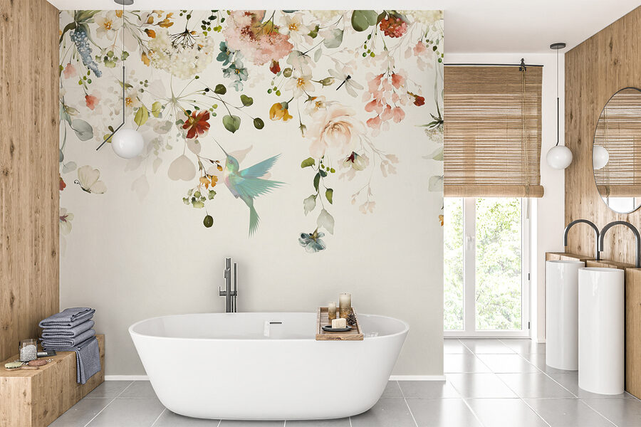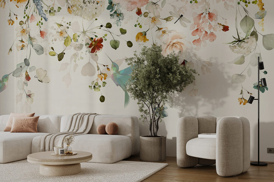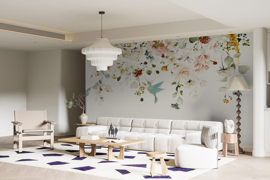 Dieses Wandbild hat eine ruhige Schönheit, die einfach… beruhigend ist. Diese Pastelltöne und die filigranen Details? Vermitteln ein gemütliches, aber dennoch elegantes Gefühl. Und dieser Kolibri – so süß und skurril, nicht wahr? Es ist fast so, als ob man das Summen seiner kleinen Flügel hören könnte. Egal, ob Sie es sich mit einem Buch gemütlich machen oder mit Freunden plaudern, dieses Wandbild schafft eine wunderbar ruhige Atmosphäre.