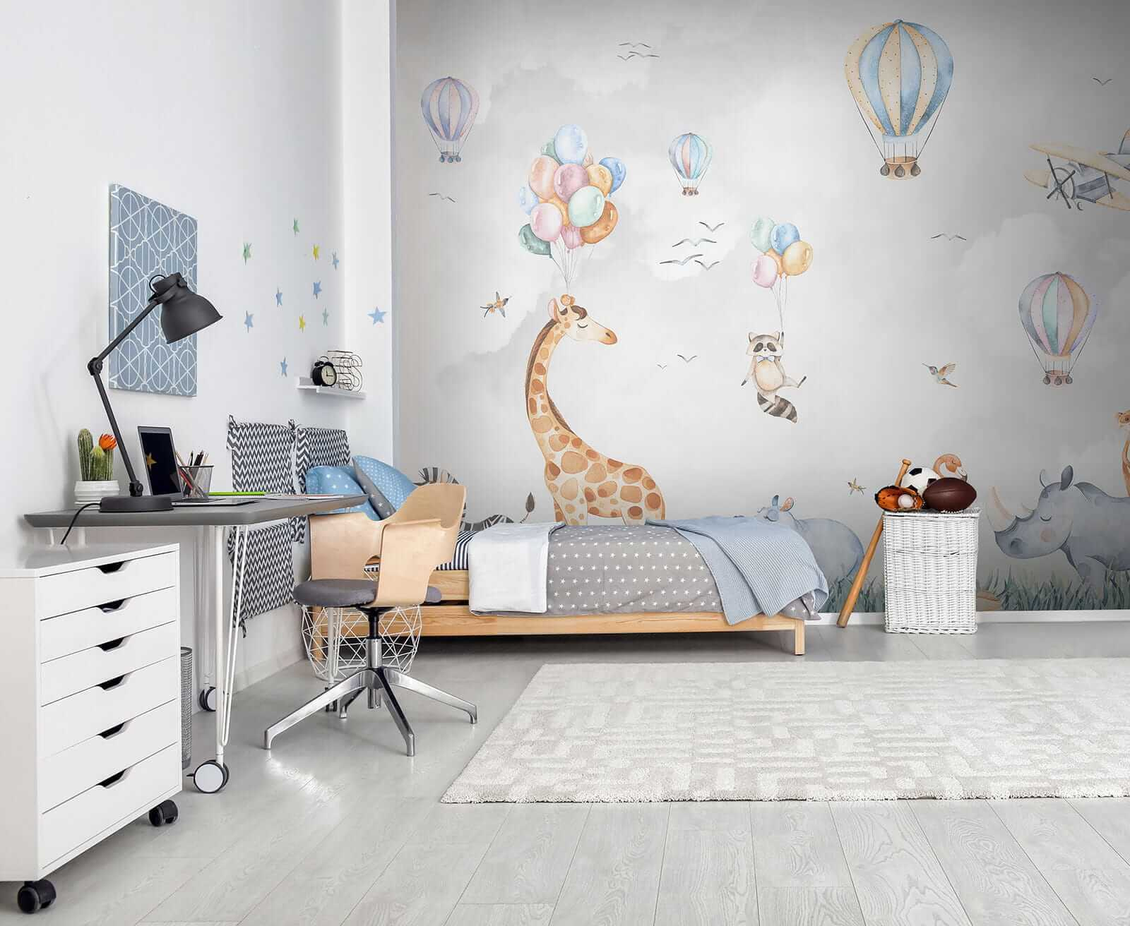 Ein Hauch von Laune für Ihr Kinderzimmer! Das Wandbild “Hippo in the Grass” ist ein absoluter Charmeur. Stellen Sie sich vor, Sie betreten ein Zimmer und fühlen sich wie auf einer zauberhaften Safari – schwebende Heißluftballons, Tiere wie Giraffen und Zebras, die in hohen Grasflächen chillen. Sogar ein frecher Waschbär, der Luftballons hält! Dieses Wandbild versprüht eine lebendige, verspielte Atmosphäre, die Kinder – und Erwachsene – lieben. Es eignet sich perfekt für ein Kinderzimmer und regt die Fantasie und das Abenteuer an. Stellen Sie sich vor, dass Gute-Nacht-Geschichten einen ganz neuen Hintergrund haben und jede Nacht zu einem kleinen Abenteuer wird. Und wer möchte nicht ein glückliches Nilpferd in seinem Zimmer haben? Ein echter Gesprächsanlass. Machen Sie sich bereit für das Staunen der Kleinen (und auch der Großen!). Das ist nicht nur Dekoration, das ist Freude an der Wand.