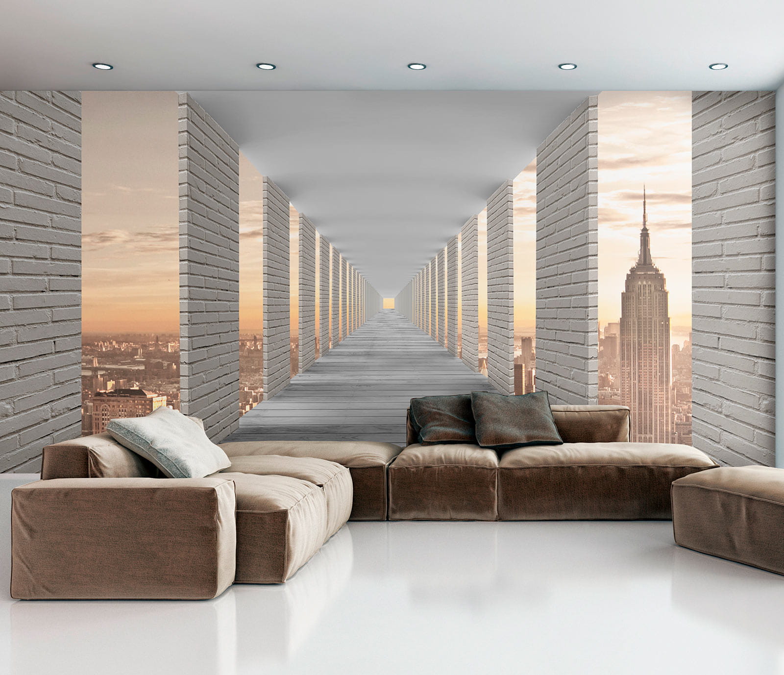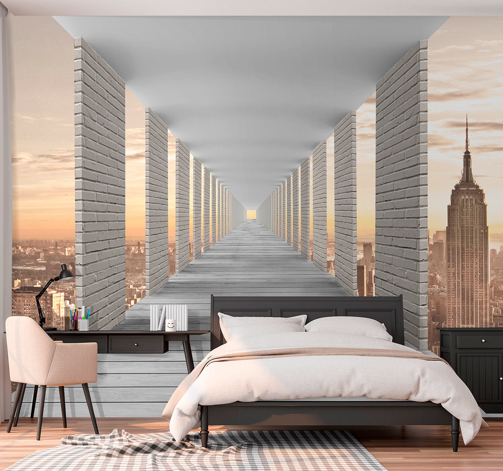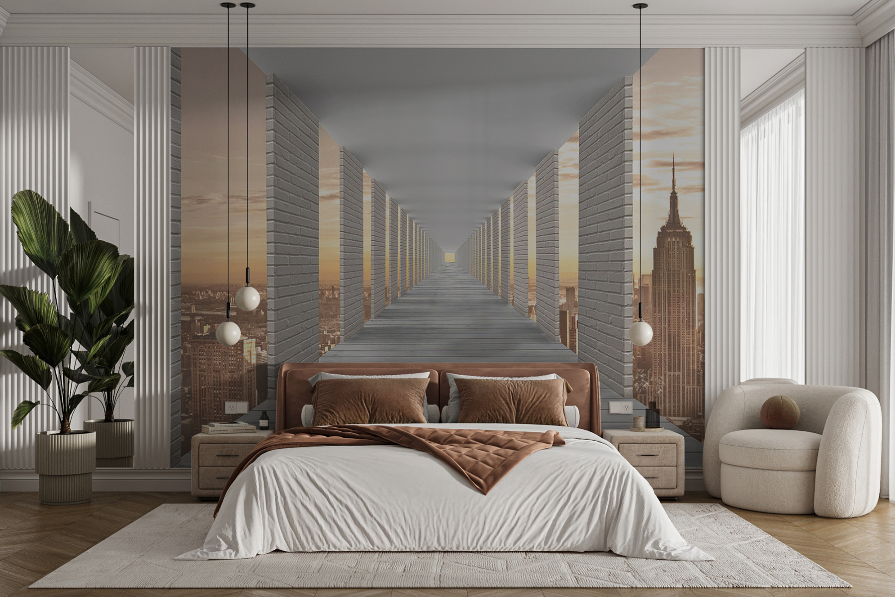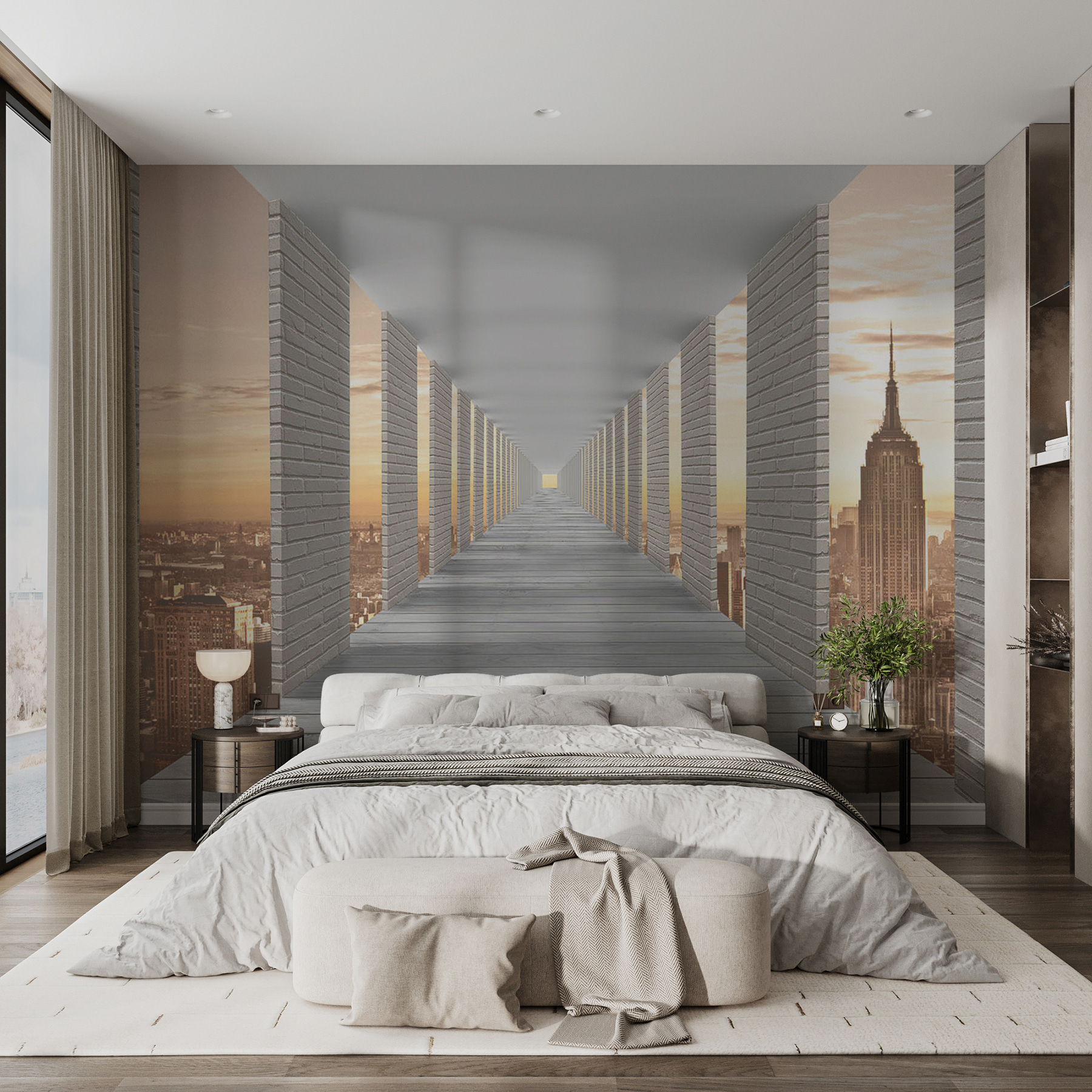 Stellen Sie sich vor, Sie hätten diese traumhafte Fototapete an der Wand, wo ein nicht enden wollender Flur zu einer magischen Stadtlandschaft führt. Die kühlen, scharfen Linien des hohen Gebäudes und die endlosen Fenster verleihen Ihrem Raum ein Gefühl von Tiefe – fast so, als wäre Ihr Zimmer erwachsen geworden und hätte eine ganz neue Ebene der Raffinesse erreicht. Die warmen Farbtöne des Sonnenuntergangs vor den “Fenstern” sorgen für eine gemütliche, aber dennoch weitläufige Atmosphäre, die sich perfekt zum Träumen eignet oder um so zu tun, als befände man sich in einem gehobenen städtischen Loft. Es ist, als hätten Ihre Wände entdeckt, dass sie fliehen können, ohne Sie zurückzulassen! Es verwandelt eine langweilige Wand in einen Gesprächsanlass. Die Atmosphäre dieses Wandgemäldes ist einfach so… urban-chic, verstehst du? Und wer hätte nicht gern eine Prise davon in seinem Wohnzimmer oder Büro?