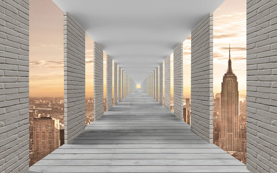 Stellen Sie sich vor, Sie hätten diese traumhafte Fototapete an der Wand, wo ein nicht enden wollender Flur zu einer magischen Stadtlandschaft führt. Die kühlen, scharfen Linien des hohen Gebäudes und die endlosen Fenster verleihen Ihrem Raum ein Gefühl von Tiefe – fast so, als wäre Ihr Zimmer erwachsen geworden und hätte eine ganz neue Ebene der Raffinesse erreicht. Die warmen Farbtöne des Sonnenuntergangs vor den “Fenstern” sorgen für eine gemütliche, aber dennoch weitläufige Atmosphäre, die sich perfekt zum Träumen eignet oder um so zu tun, als befände man sich in einem gehobenen städtischen Loft. Es ist, als hätten Ihre Wände entdeckt, dass sie fliehen können, ohne Sie zurückzulassen! Es verwandelt eine langweilige Wand in einen Gesprächsanlass. Die Atmosphäre dieses Wandgemäldes ist einfach so… urban-chic, verstehst du? Und wer hätte nicht gern eine Prise davon in seinem Wohnzimmer oder Büro?