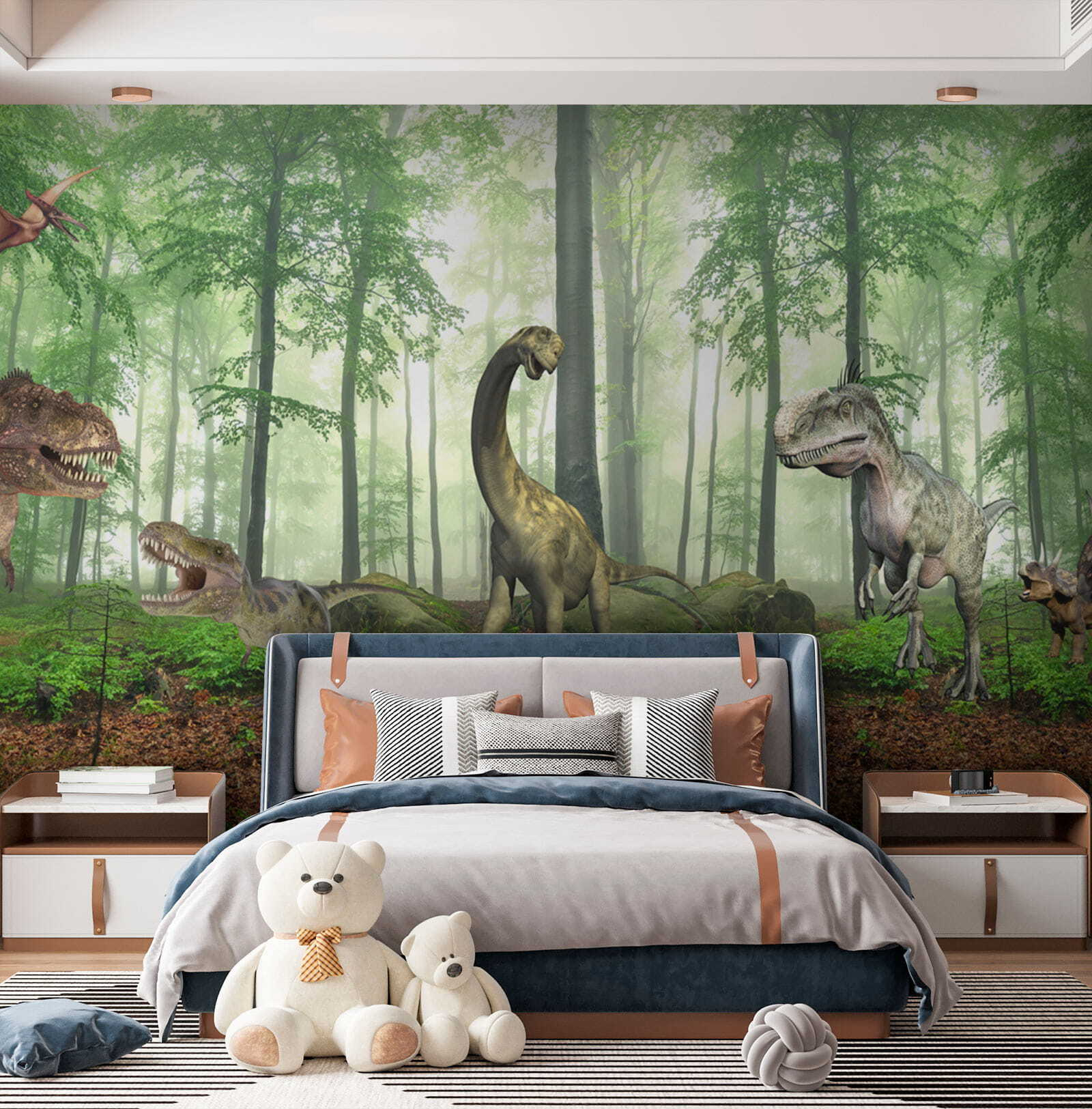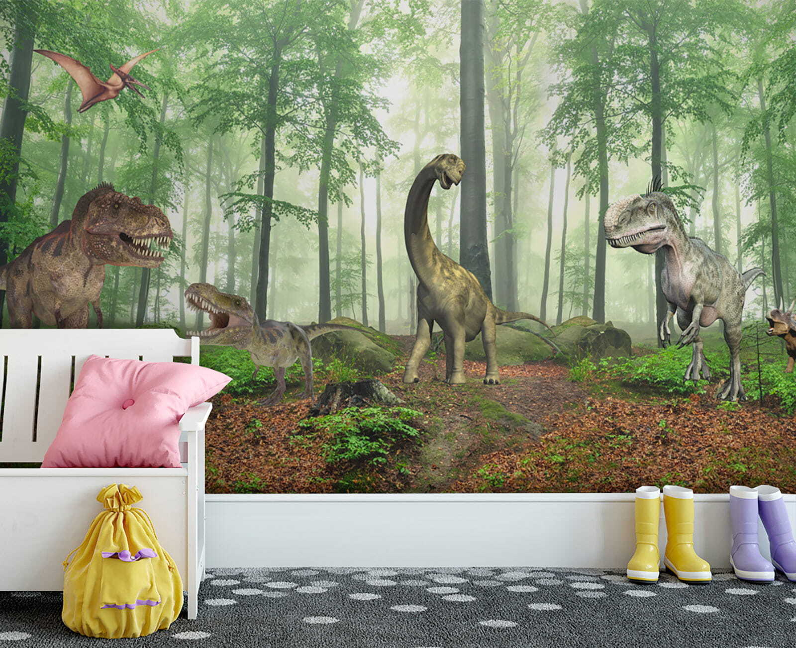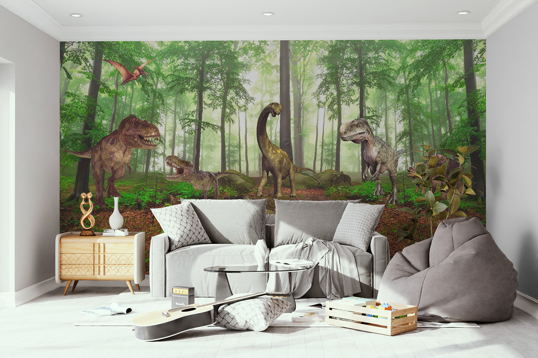 Treten Sie ein in die prähistorische Welt mit dieser umwerfenden Fototapete “Dinosaurier im Wald”. Stellen Sie sich vor, Sie verwandeln jedes Zimmer in einen lebendigen Jurawald – Kinder werden sich wie kleine Entdecker fühlen, die sich zwischen hoch aufragenden Bäumen und freundlichen Dinosauriern bewegen. Es ist perfekt, um die Fantasie der Kinder anzuregen, und wer weiß, vielleicht müssen Sie sogar während der Spielzeit dem T-Rex ausweichen! Das üppige Grün und die detailgetreuen Dinos fühlen sich fast lebensecht an und bringen ein bisschen Abenteuer und Staunen in den Alltag. Eine reizvolle Ergänzung für jedes Kinderzimmer oder sogar eine lustige Abwechslung für mutige Dekorationsliebhaber. Beifallsstürme garantiert!