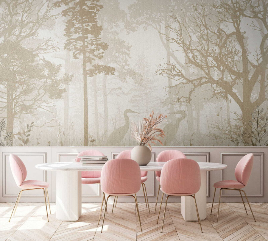 Stellen Sie sich einen ruhigen Morgen vor, an dem Reiher friedlich durch einen nebligen Wald wandern. Diese Fototapete wirkt wie ein sanftes Flüstern der Natur – perfekt, um einen Hauch von Ruhe in jeden Raum zu bringen. Es ist stimmungsvoll und geheimnisvoll, aber auch erfrischend malerisch und damit ein Blickfang in jedem Einrichtungskonzept. Kinder lieben es wegen der Märchenbuchatmosphäre, während Erwachsene die Eleganz der Aquarelle zu schätzen wissen. Stellen Sie sich diese atemberaubende, waldige Szene in einem Kinderzimmer oder einer gemütlichen Leseecke vor – sie ist wie ein Hauch von frischer Luft, wenn die Welt zu laut wird.