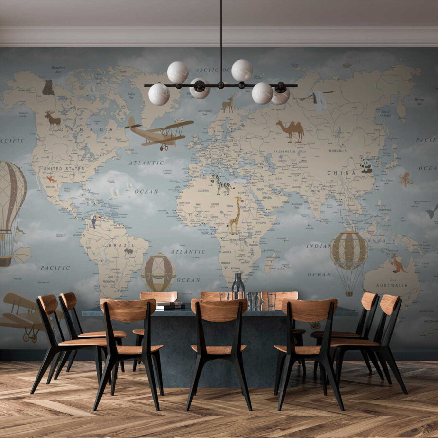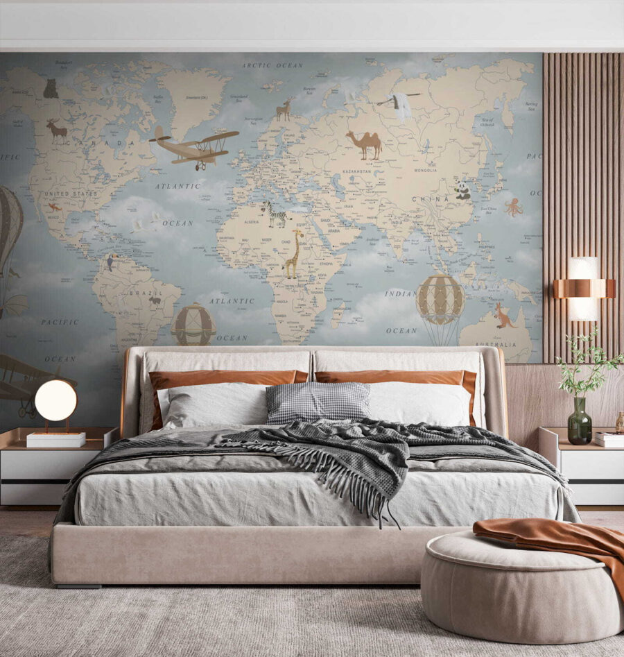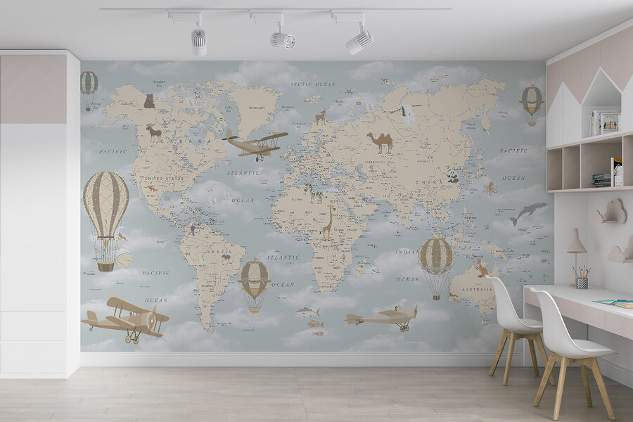 Wenn Sie dieses Wandbild in Ihren Raum integrieren, geht es nicht nur um Dekoration, sondern auch darum, eine Kulisse für Geschichten und Fantasie zu schaffen. Stellen Sie sich vor, wie Ihr Kind mit den Fingern auf der Karte entlangfährt, von Abenteuern in fernen Ländern träumt oder sogar zukünftige Reisen plant. Außerdem macht es nicht nur den Kindern Spaß, sondern sorgt auch bei jedem, der das Zimmer betritt, für Gesprächsstoff. Können Sie sich nicht vorstellen, wie die Kleinen zeigen, wo sie sich auf der Karte befinden, oder sich Geschichten über die Tiere ausdenken, die sie entdecken?