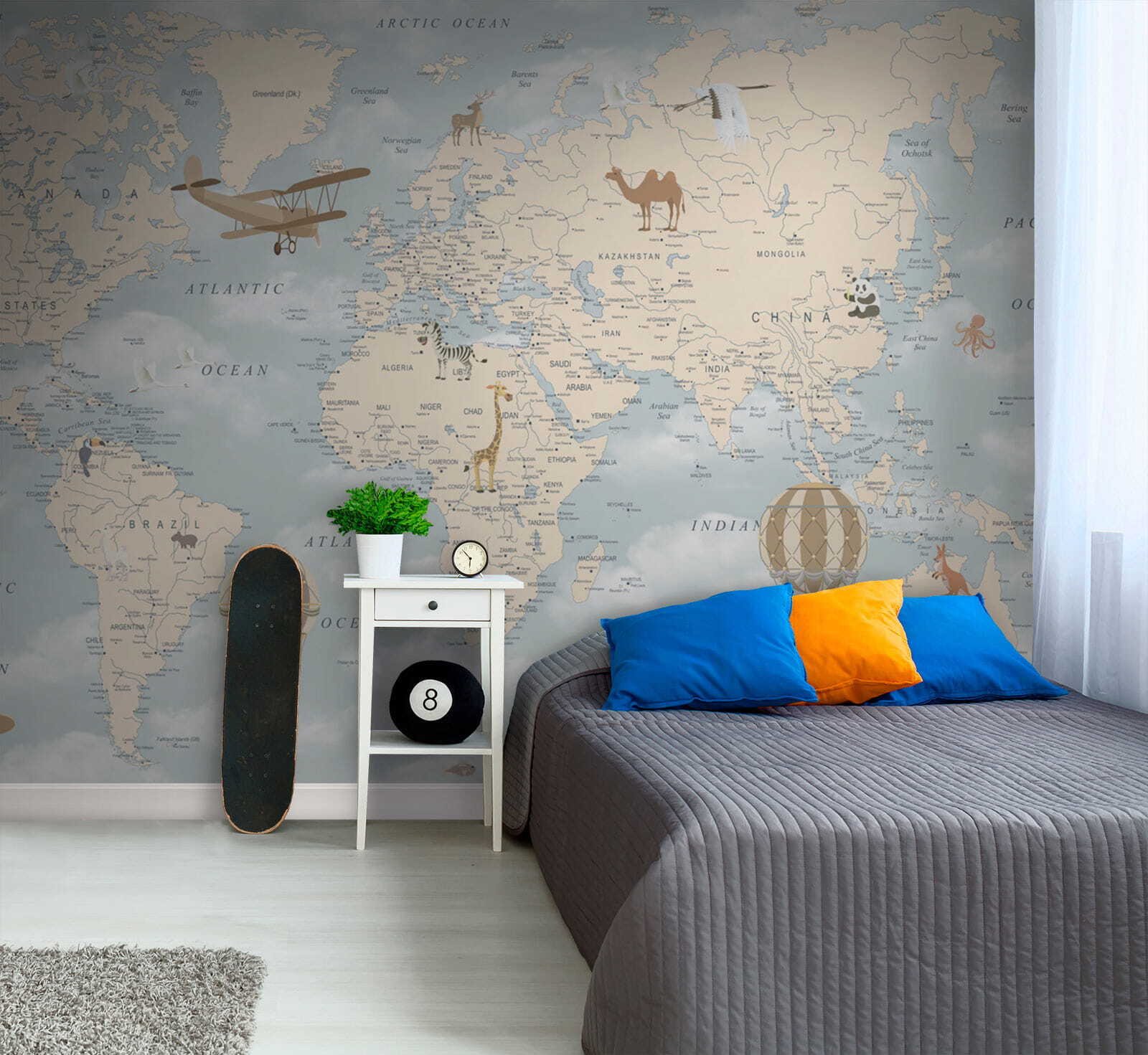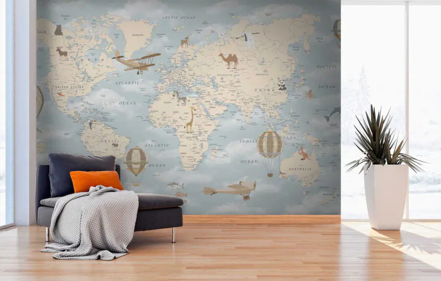 Wenn Sie dieses Wandbild in Ihren Raum integrieren, geht es nicht nur um Dekoration, sondern auch darum, eine Kulisse für Geschichten und Fantasie zu schaffen. Stellen Sie sich vor, wie Ihr Kind mit den Fingern auf der Karte entlangfährt, von Abenteuern in fernen Ländern träumt oder sogar zukünftige Reisen plant. Außerdem macht es nicht nur den Kindern Spaß, sondern sorgt auch bei jedem, der das Zimmer betritt, für Gesprächsstoff. Können Sie sich nicht vorstellen, wie die Kleinen zeigen, wo sie sich auf der Karte befinden, oder sich Geschichten über die Tiere ausdenken, die sie entdecken?
