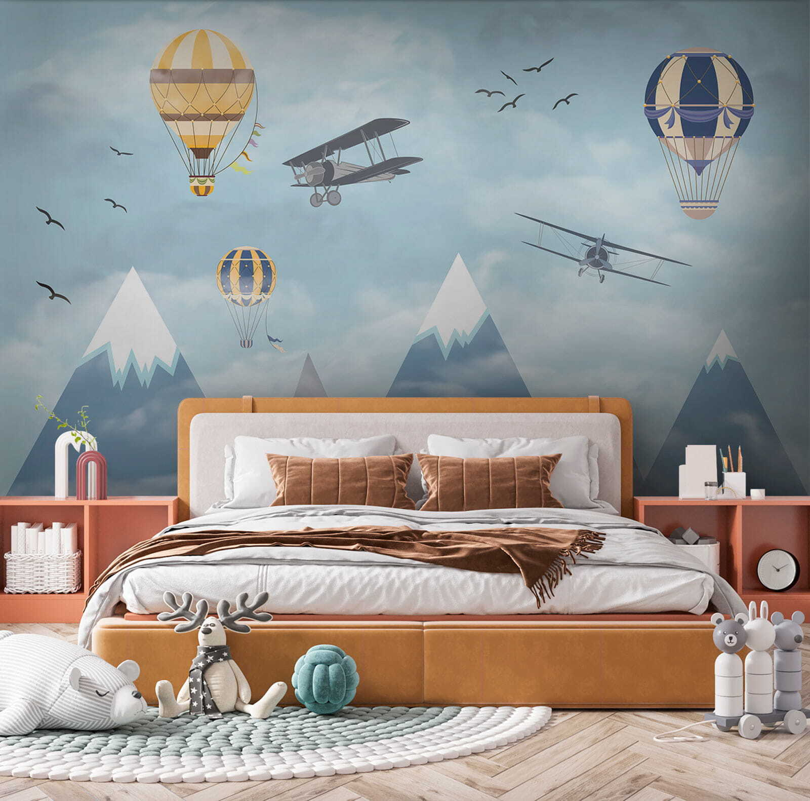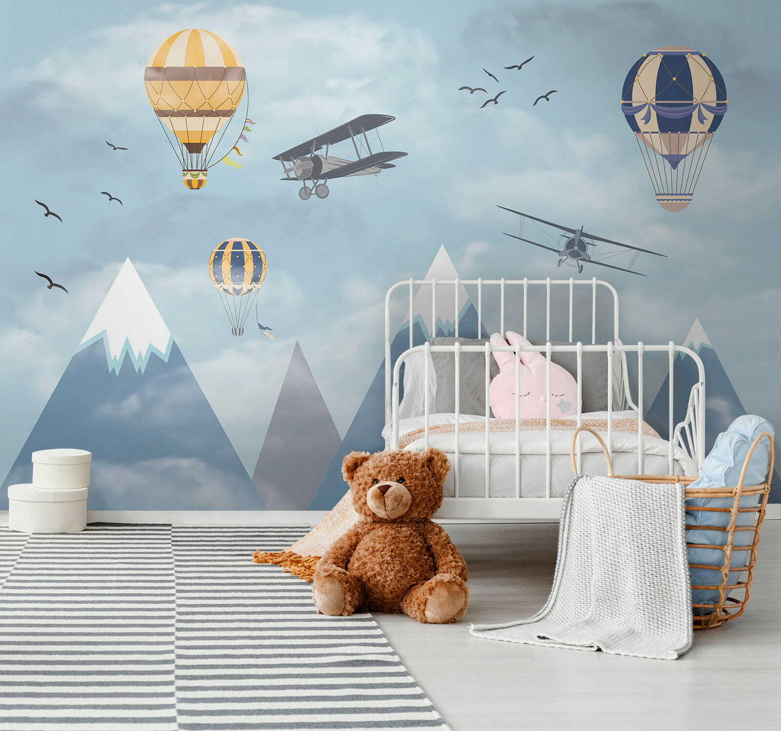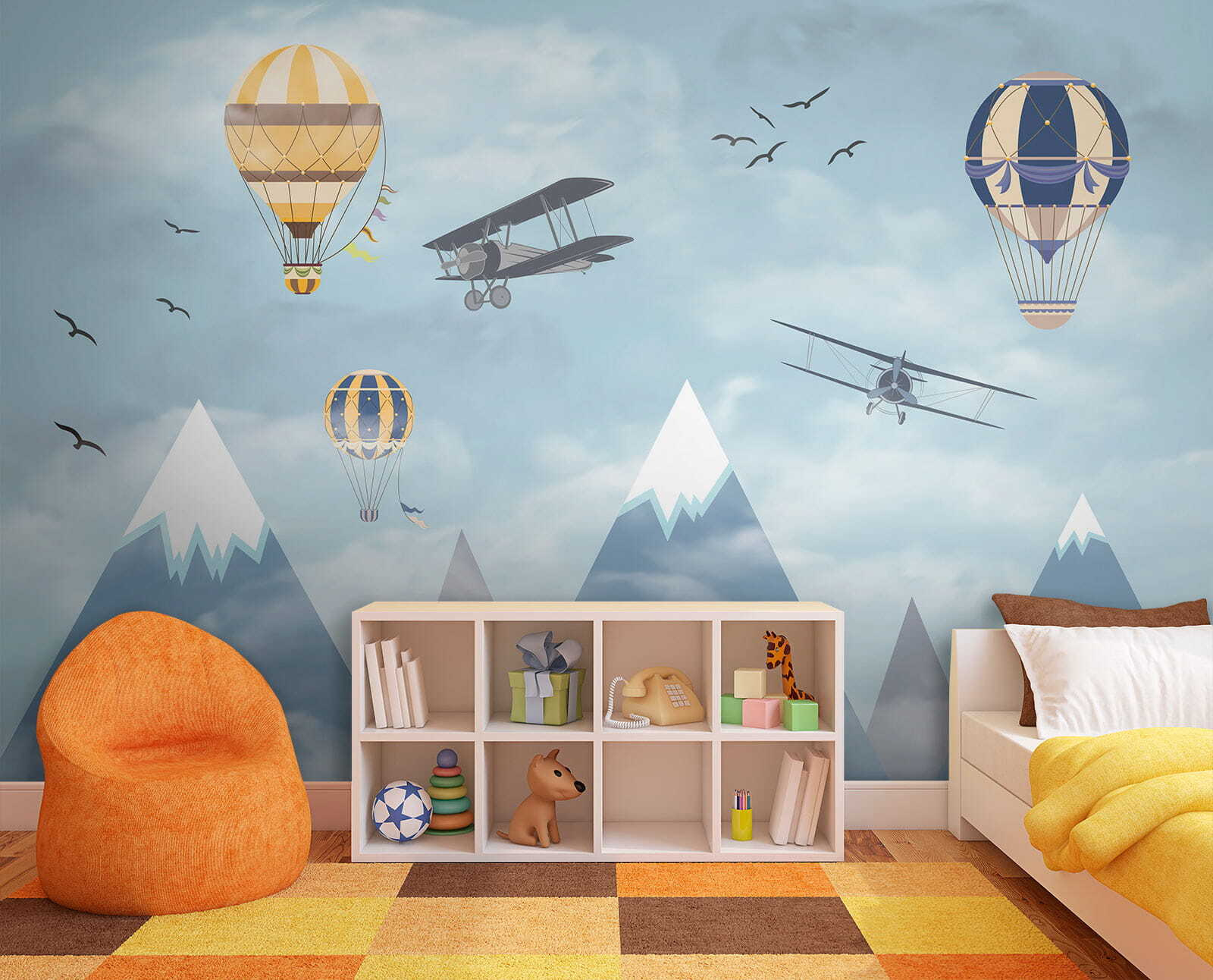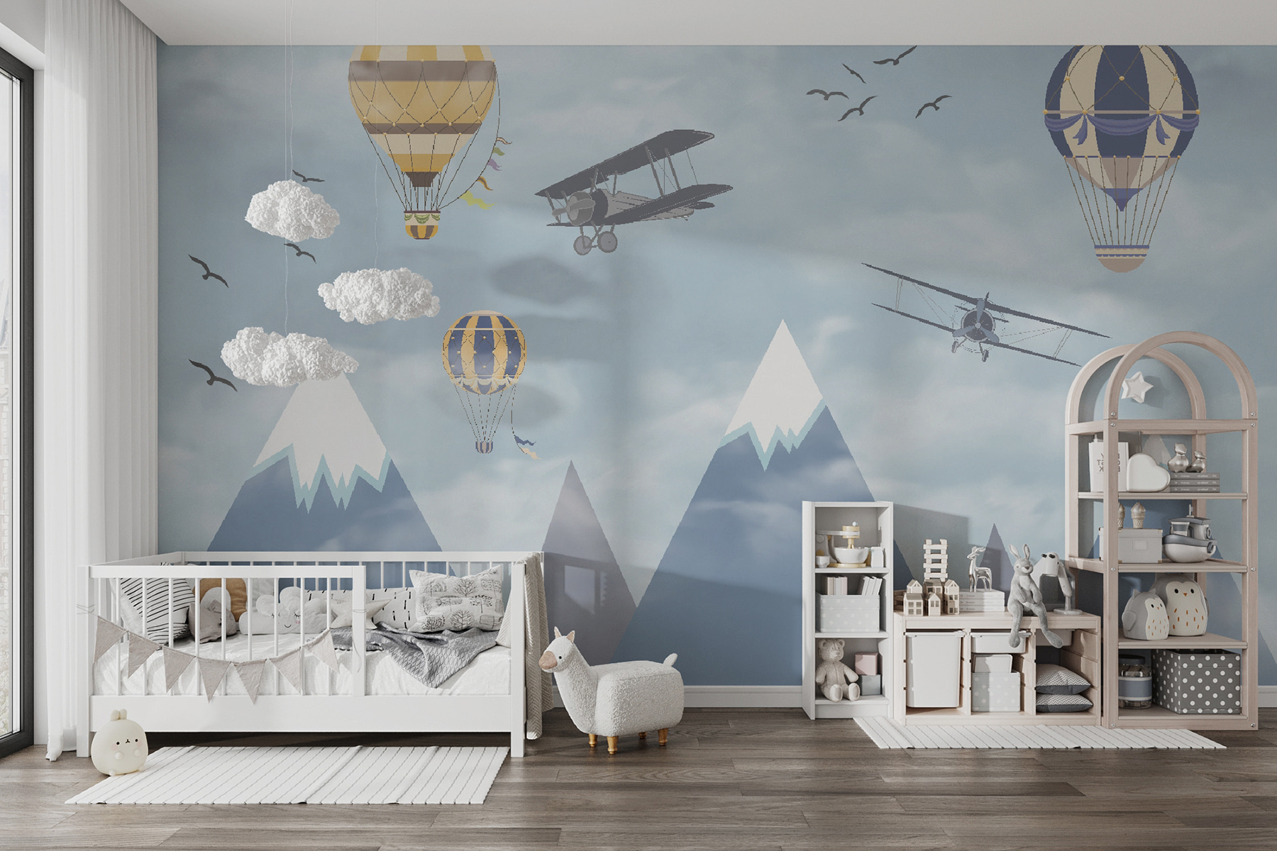 Stellen Sie sich vor, Sie wachen auf und sehen einen Himmel voller skurriler Heißluftballons, die zwischen den Wolken schweben, neben abenteuerlichen Flugzeugen, die vorbeifliegen, und Vögeln, die hoch aufsteigen – das ist pure Magie! Die Fototapete “Heißluftballon am Himmel” bringt ein Gefühl des Wunders und des Abenteuers direkt ins Zimmer. Es eignet sich perfekt, um Kreativität und Träume im Kinderzimmer zu wecken, denn es ist, als würde man den Kindern eine Leinwand geben, auf der sie ihrer Fantasie freien Lauf lassen können. Die pastellfarbenen Blautöne und die sanften Wolken wirken so beruhigend, dass der Raum leicht und luftig wirkt. Es ist nicht nur Dekoration – es ist eine Reise in den Himmel, ohne den Raum zu verlassen. Auch die Eltern könnten einen Hauch von Nostalgie verspüren, wenn sie von fernen Orten und waghalsigen Reisen träumen. Wer wünscht sich nicht ein bisschen davon in seinem Zuhause? Und diese schneebedeckten Berge im Hintergrund? Einfach zauberhaft. Dieses Wandbild ist im Grunde ein Tagtraum in Form von Wandkunst – unendlich charmant und wunderschön heiter. Die Kinder werden es lieben, und auch das Kind in Ihnen wird es lieben.