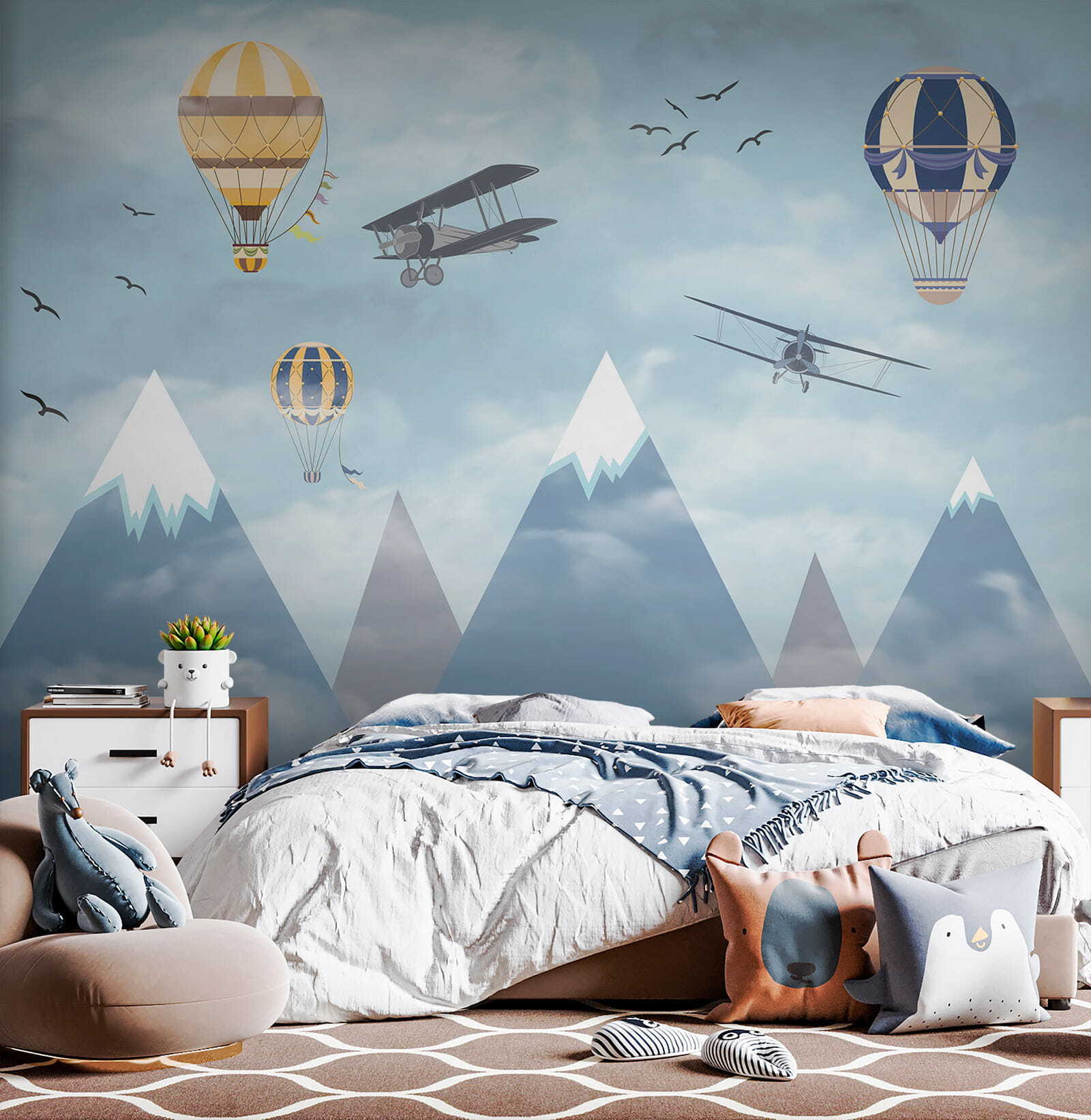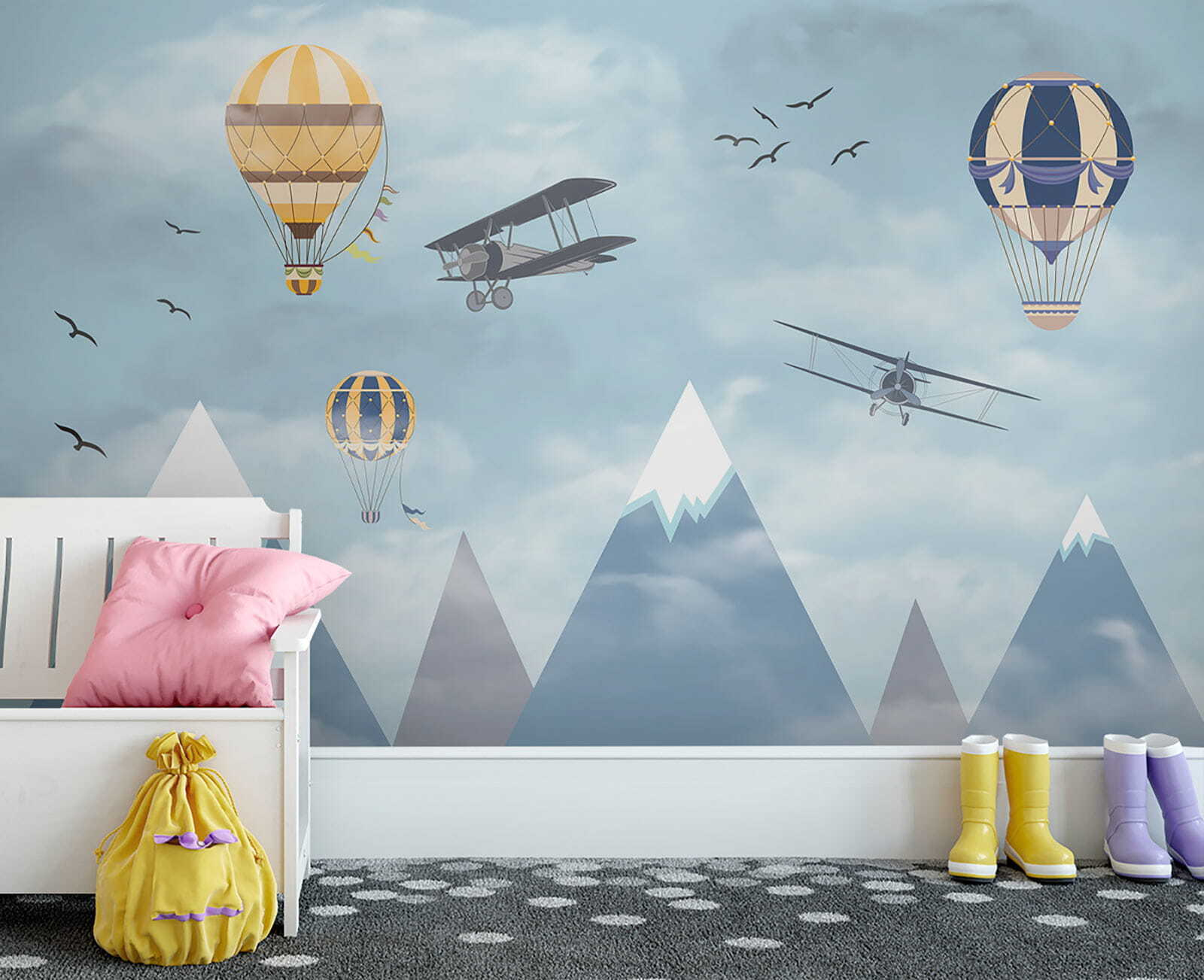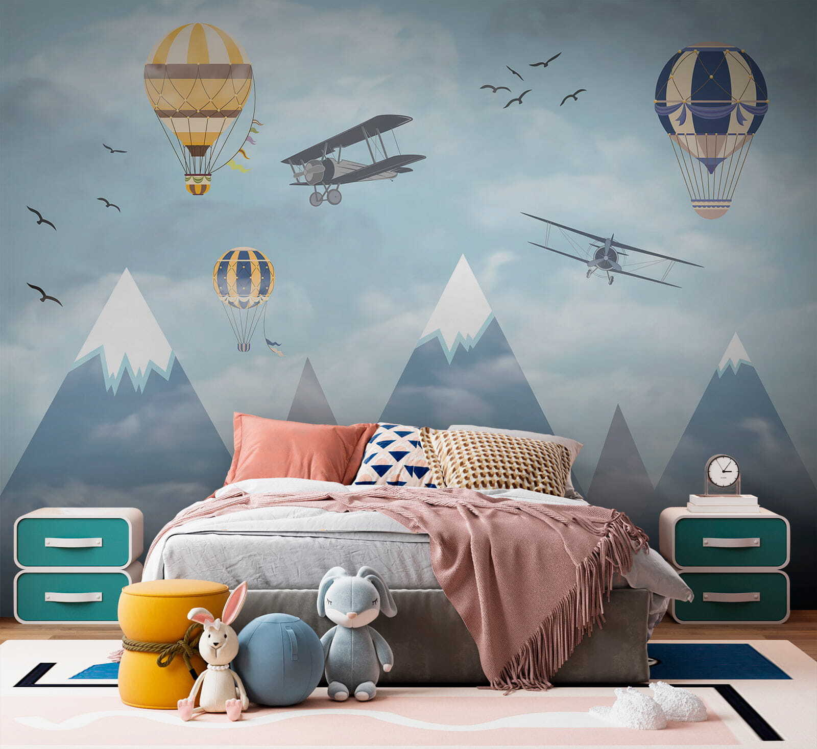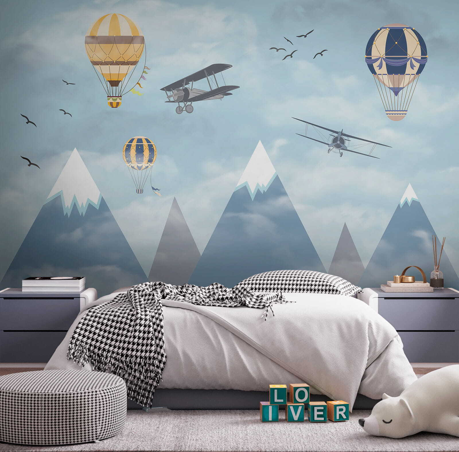 Stellen Sie sich vor, Sie wachen auf und sehen einen Himmel voller skurriler Heißluftballons, die zwischen den Wolken schweben, neben abenteuerlichen Flugzeugen, die vorbeifliegen, und Vögeln, die hoch aufsteigen – das ist pure Magie! Die Fototapete “Heißluftballon am Himmel” bringt ein Gefühl des Wunders und des Abenteuers direkt ins Zimmer. Es eignet sich perfekt, um Kreativität und Träume im Kinderzimmer zu wecken, denn es ist, als würde man den Kindern eine Leinwand geben, auf der sie ihrer Fantasie freien Lauf lassen können. Die pastellfarbenen Blautöne und die sanften Wolken wirken so beruhigend, dass der Raum leicht und luftig wirkt. Es ist nicht nur Dekoration – es ist eine Reise in den Himmel, ohne den Raum zu verlassen. Auch die Eltern könnten einen Hauch von Nostalgie verspüren, wenn sie von fernen Orten und waghalsigen Reisen träumen. Wer wünscht sich nicht ein bisschen davon in seinem Zuhause? Und diese schneebedeckten Berge im Hintergrund? Einfach zauberhaft. Dieses Wandbild ist im Grunde ein Tagtraum in Form von Wandkunst – unendlich charmant und wunderschön heiter. Die Kinder werden es lieben, und auch das Kind in Ihnen wird es lieben.