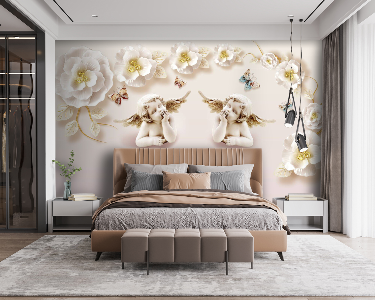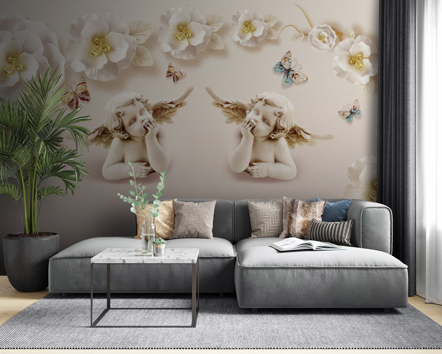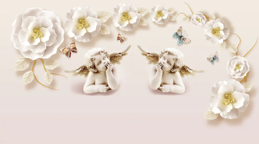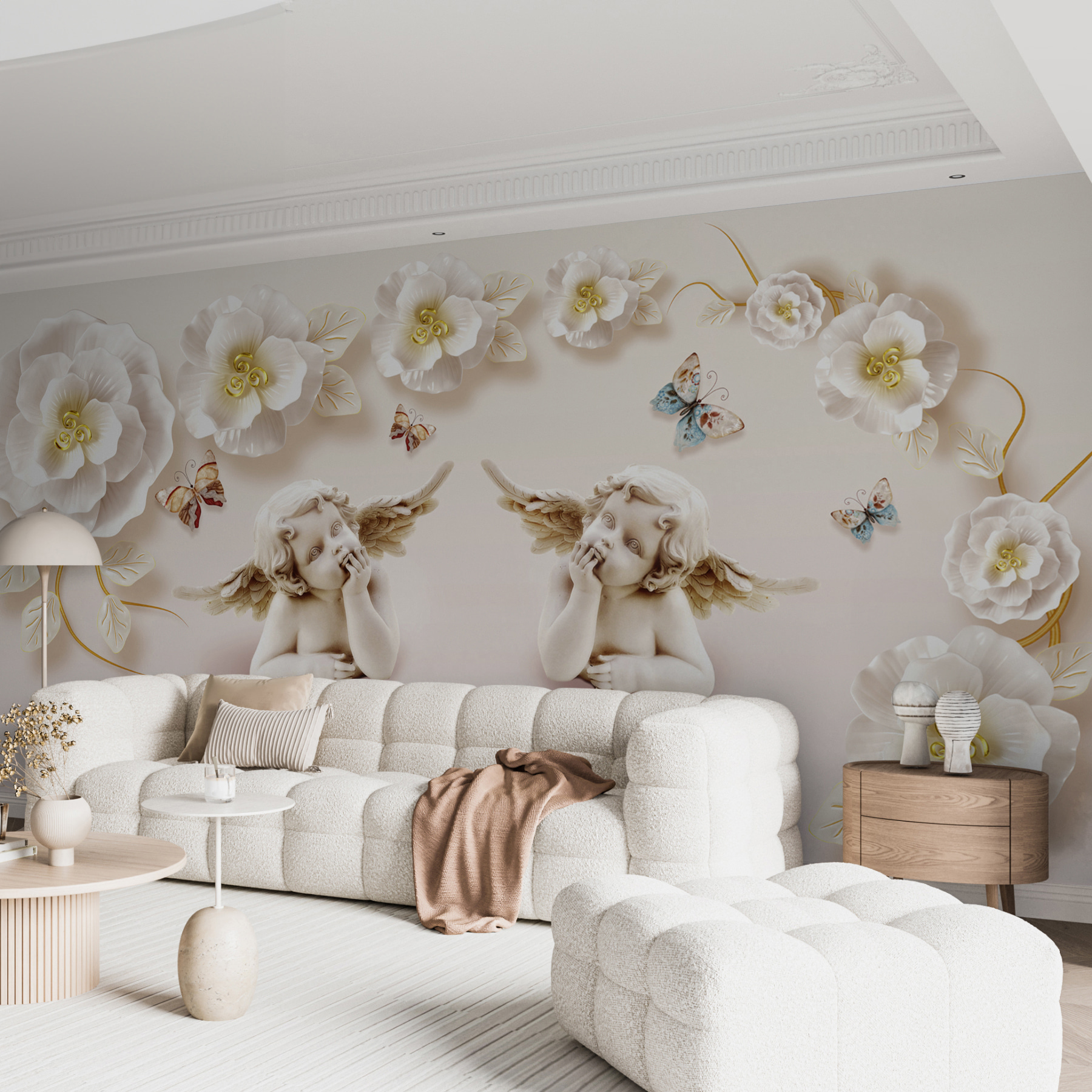 Stellen Sie sich das an Ihrer Wand vor – ein Paar niedlicher kleiner Engel mit Flügeln, umgeben von verträumten, übergroßen Blumen und sanft flatternden Schmetterlingen. Jedes Mal, wenn Sie den Raum betreten, ist es, als würden Sie einen Märchengarten betreten. Diese Fototapete ist nicht nur Dekoration – sie ist eine ganze Stimmung. Stellen Sie sich vor, Sie kommen nach einem langen Tag nach Hause, und diese heitere Szene empfängt Sie und hebt sofort Ihre Laune. Ideal für alle, die einen Hauch von Laune mit einer Prise Eleganz lieben. Außerdem ist es ein toller Gesprächsanlass – Ihre Gäste werden von Ihrem künstlerischen Geschmack schwärmen. Hier trifft Architektur auf märchenhaften Charme – perfekt für alle, die sich nach ein wenig Zauber in ihrem Alltag sehnen.