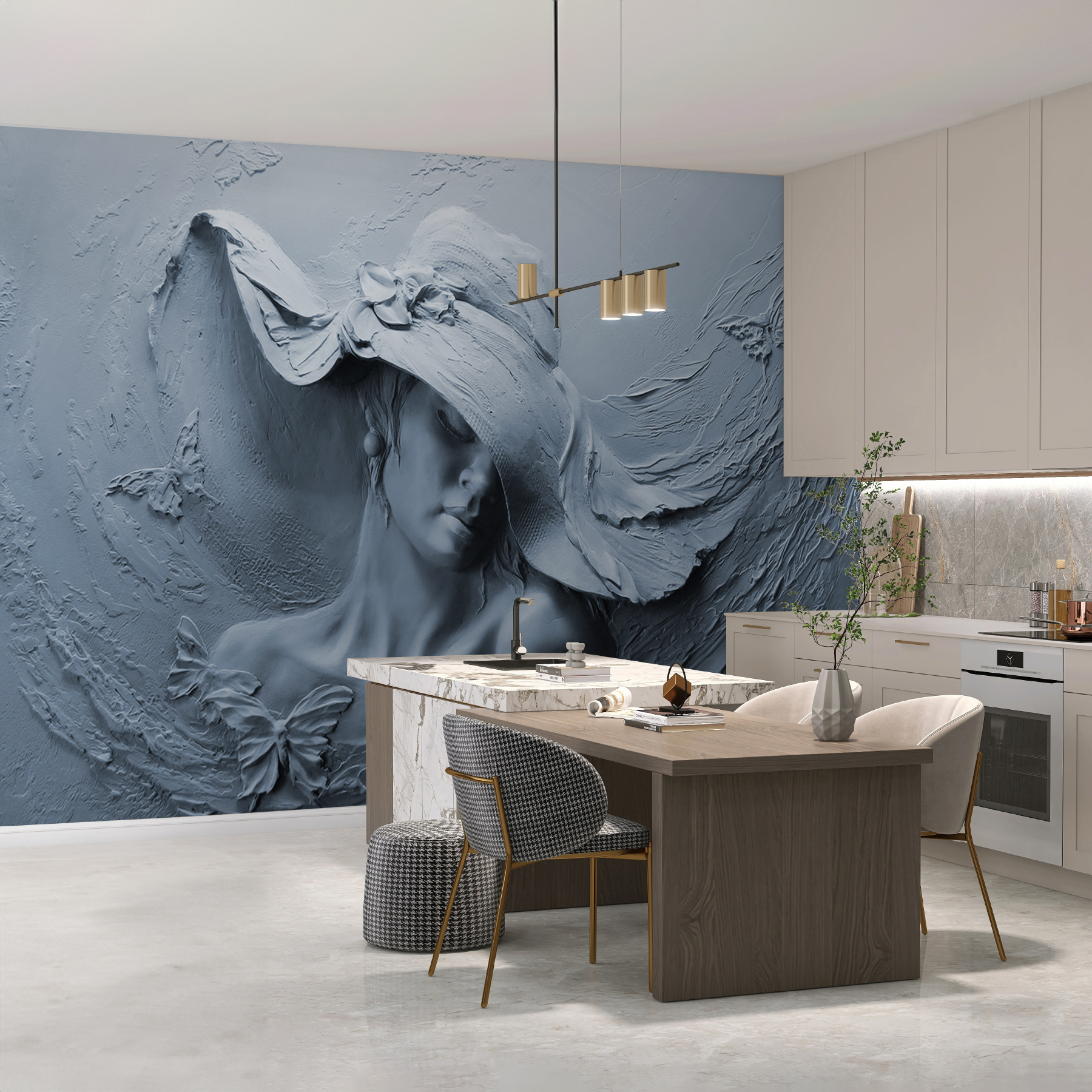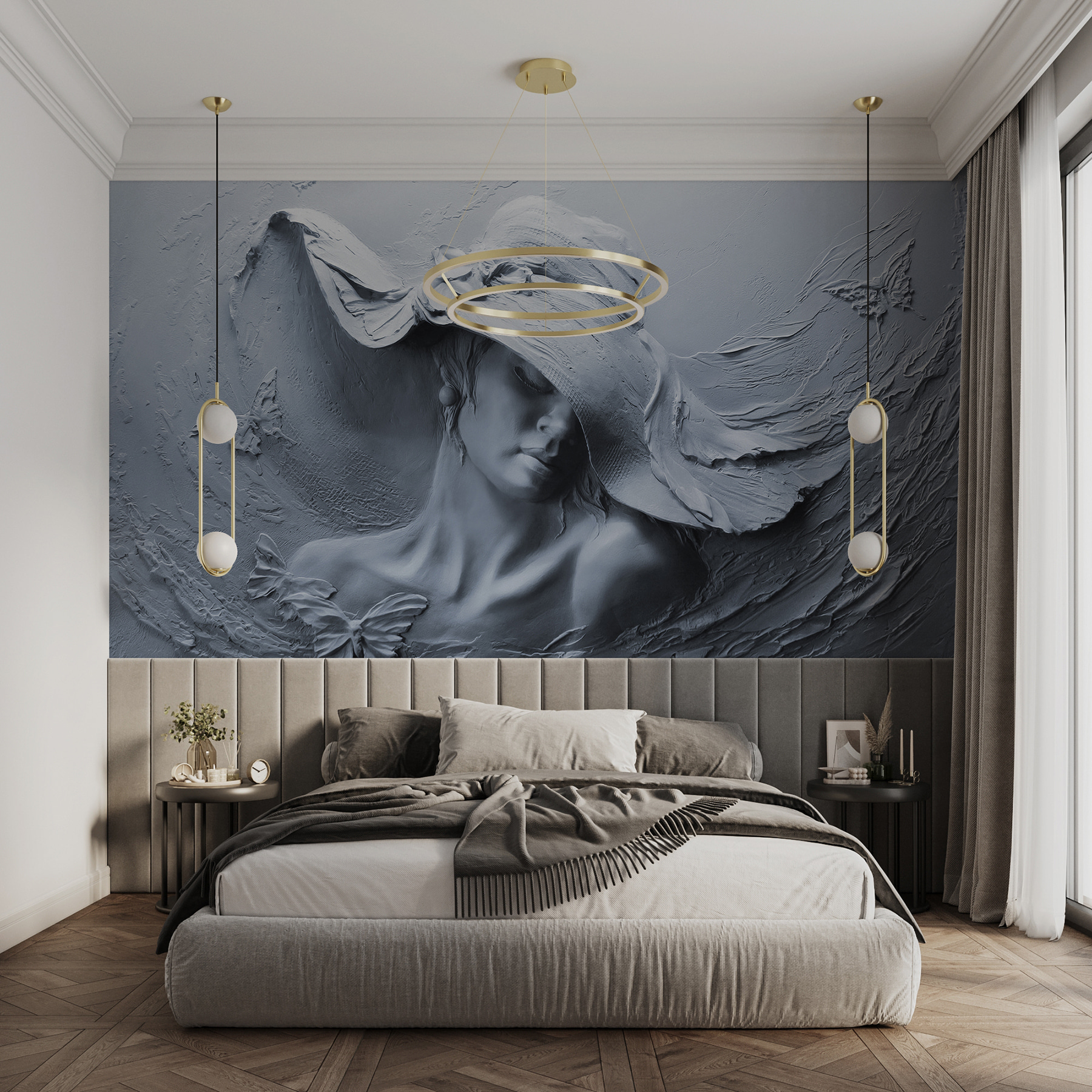 Verwandeln Sie Ihren Raum mit dieser fesselnden Fototapete, die eine heitere Skulptur einer Frau mit einem Hut zeigt. Es ist, als ob Sie eine sanfte Brise in Ihren Raum bringen würden – und das wirkt sofort belebend. Stellen Sie sich vor, Sie lehnen sich mit Ihrem Lieblingsbuch zurück, und die zarten Schmetterlinge, die sie umschwirren, wirken fast lebendig. Dieses auffällige Stück sorgt nicht nur für visuelles Interesse, es regt auch zu Tagträumen und Geschichten an. Perfekt, um die Kreativität zu fördern oder einfach nur ein Lächeln zu zaubern, wenn Sie vorbeigehen. Sie haben eine leere Wand? Dieses Wandbild ist wie eine warme Umarmung, einladend und ein wenig geheimnisvoll. Perfekt für jeden, der einzigartige Dekoration liebt, die die Seele anspricht.