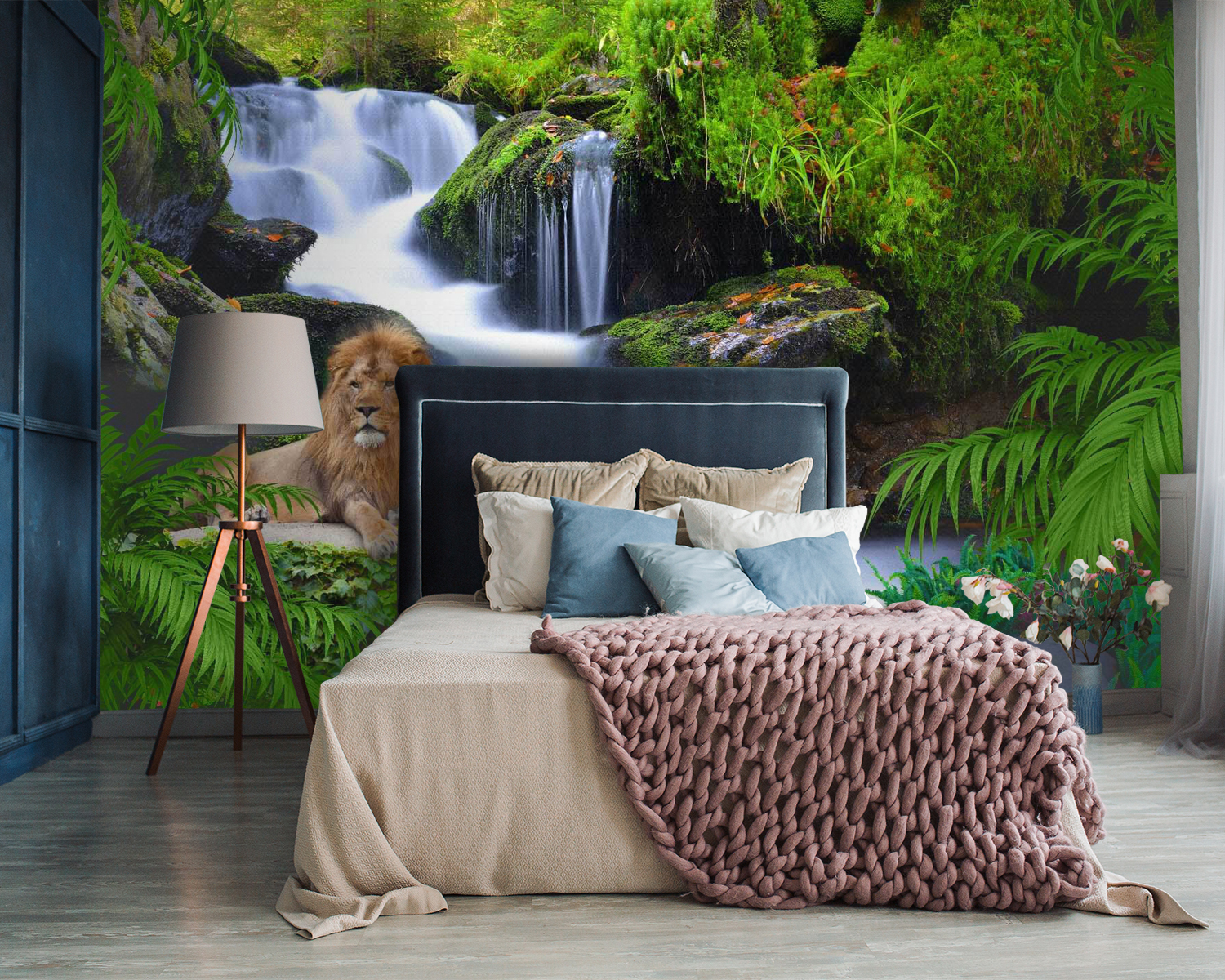 Diese Fototapete hat alles: üppige Farne, üppiges Grün und einen majestätischen Wasserfall, der über moosbewachsene Felsen stürzt. Oh, und haben Sie den königlichen Löwen gesehen, der es sich auf seinem persönlichen Dschungelthron bequem gemacht hat? Stellen Sie sich diese Schönheit in Ihrem Wohnzimmer vor… es ist, als würde man sich ein Stück wildes Paradies ins Haus holen. Perfekt für alle, die davon träumen, von der Natur umgeben zu sein (ohne Ungeziefer und Feuchtigkeit). Durch die leuchtenden Farben wirkt es lebendig, fast so, als ob man das Wasser plätschern hören und die frische Waldluft spüren könnte. Es ist der Traum eines jeden Tierliebhabers, ein Paradies für Naturliebhaber und eine einzigartige Abwechslung für alle, die von langweiligen, einfarbigen Wänden genug haben. Ob Kinder oder Erwachsene, alle werden staunen und sich wahrscheinlich wünschen, sie hätten schon früher umdekoriert. So verwandelt man einen Raum!