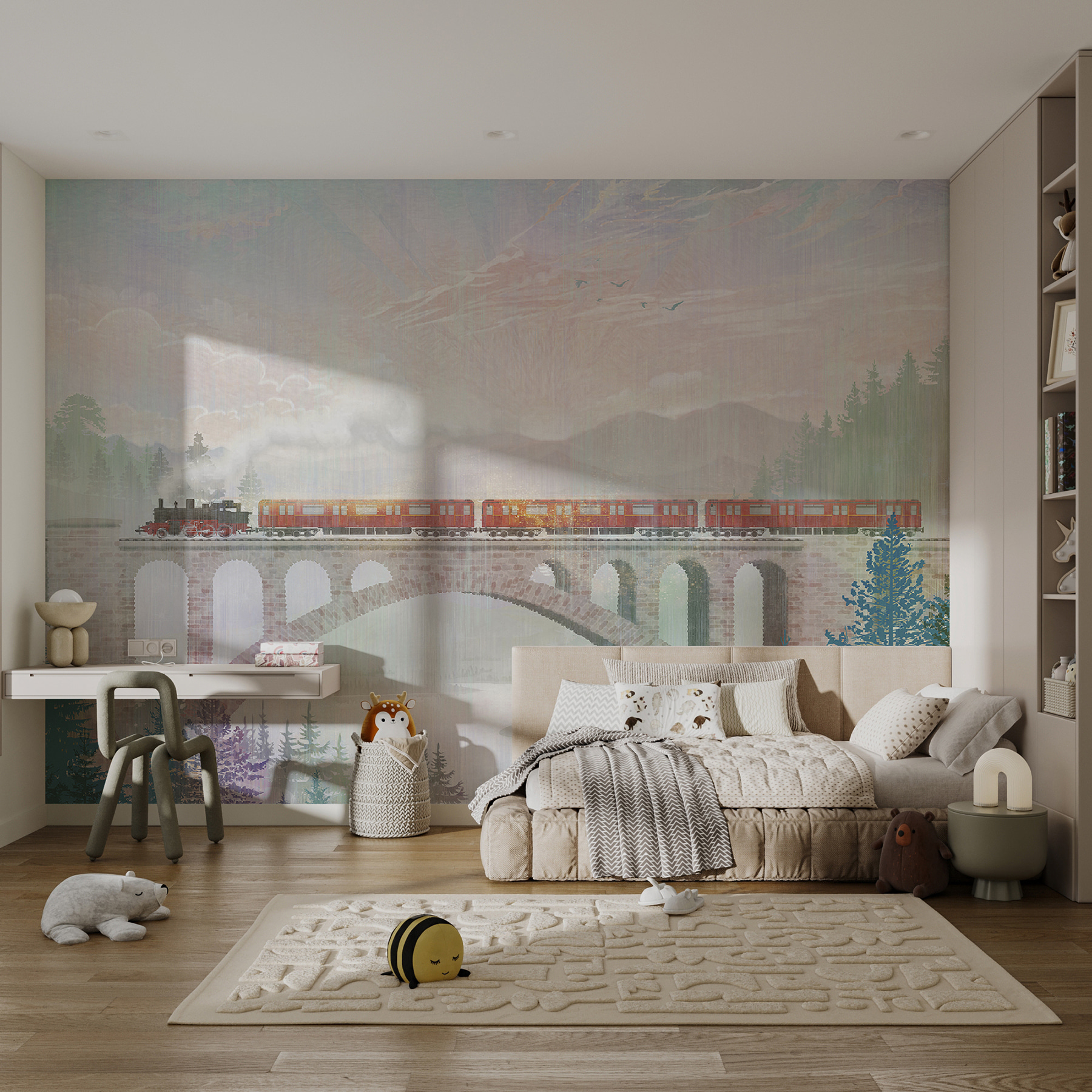 Stellen Sie sich vor: Wenn Sie einen Raum mit dem Wandgemälde “Bridge over a River” betreten, fühlen Sie sich in eine Szene versetzt, die einer alten Reisepostkarte entsprungen ist. Stellen Sie sich einen gemütlichen Nachmittag vor, an dem Sie Tee schlürfen, während diese Szene die Wände vor Nostalgie singen lässt. Die bezaubernde Brücke und der tuckernde Zug schaffen eine heitere, fast märchenhafte Atmosphäre – perfekt für alle, die sich nach einem Hauch von Abenteuer sehnen, ohne dabei auf die Gemütlichkeit ihres Zuhauses verzichten zu müssen. Es ist nicht nur eine Wandmalerei, sondern eine Einladung zum Träumen. Die sanften Pastelltöne und die nebligen Kiefern bilden einen beruhigenden Hintergrund, so dass man fast die Vögel zwitschern hören und den frischen Morgentau riechen kann. Egal, ob Sie ein eingefleischter Dekorationsliebhaber sind oder einfach nur jemand, der die kleinen magischen Momente zu schätzen weiß, dieses Wandbild bringt einen Hauch von zeitlosem Reisecharme direkt in Ihren Raum. Drehen Sie Ihre Lieblingsmusik auf, betrachten Sie diese Fototapete und lassen Sie sich jeden Tag auf diese friedliche Brücke entführen.