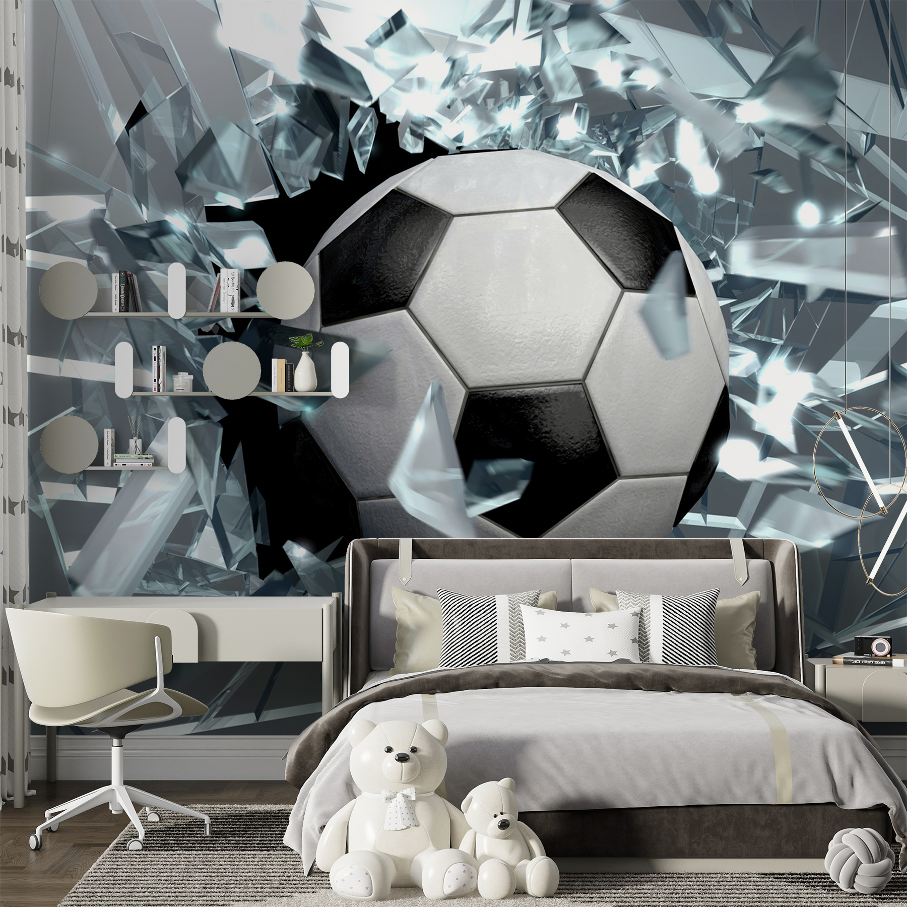 Diese Fototapete verwandelt einen Raum in ein lebhaftes Abenteuer und bringt die aufregende Energie des Fußballs direkt an Ihre Wand. Stellen Sie sich einen starken Fußball vor, der eine imaginäre Barriere durchbricht, während Glasscherben eine lebhafte Stimmung verbreiten. Es ist, als hätte Ihr Raum gerade das ultimative Tor geschossen, und damit perfekt für Kinder, die davon träumen, Superstars auf dem Spielfeld zu werden. Stellen Sie sich vor, Freunde kommen vorbei, die Augen weiten sich, und Fragen werden gestellt. Welches Kind würde sich mit dieser dynamischen Szene nicht wie ein Champion fühlen? Es ist mehr als nur Dekoration, es ist Inspiration, Aufregung und eine Menge Spaß!