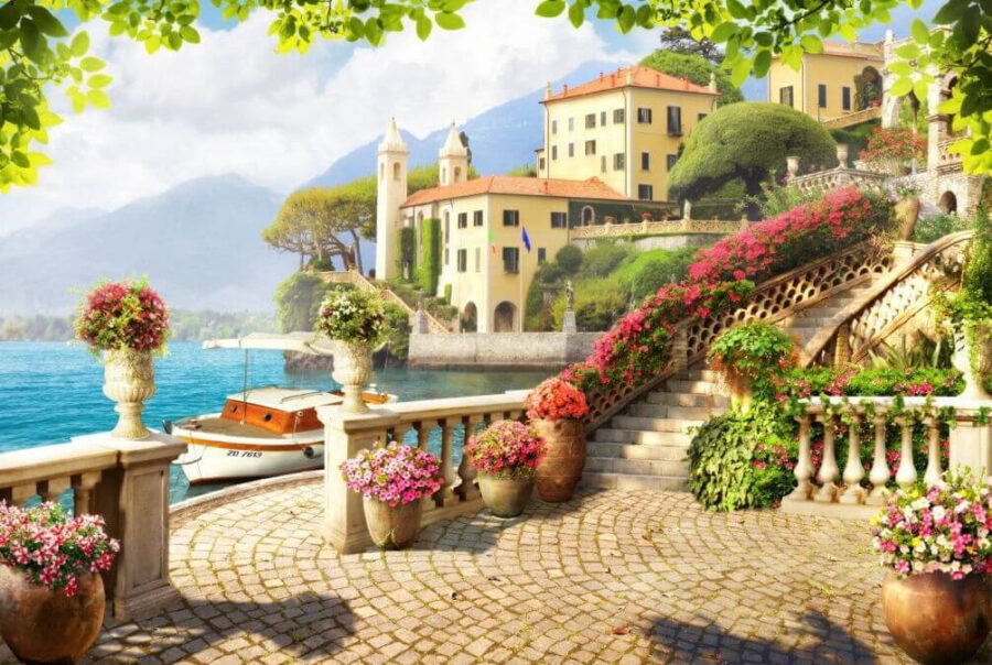 Die Farben sind sehr lebendig – die leuchtenden Rosatöne im Kontrast zu den sanften Blautönen des Wassers. Es ist wie ein Ausbruch von Freude. Stellen Sie sich vor, wie Sie mit einem Kaffee in der Hand die Ruhe aufsaugen. Vielleicht sogar mit einem guten Buch. Diese Fototapete fügt sich nahtlos in die moderne Einrichtung ein, hat aber auch einen zeitlosen, klassischen Touch. Es fühlt sich wie ein sofortiges Upgrade an, oder? Außerdem bringen die steinernen Wege und die detaillierte Architektur ein bisschen europäisches Flair in jeden Raum. Ihre Gäste werden denken, dass Sie Ihr Zuhause in ein Boutique-Hotel verwandelt haben. Wer würde das nicht wollen?