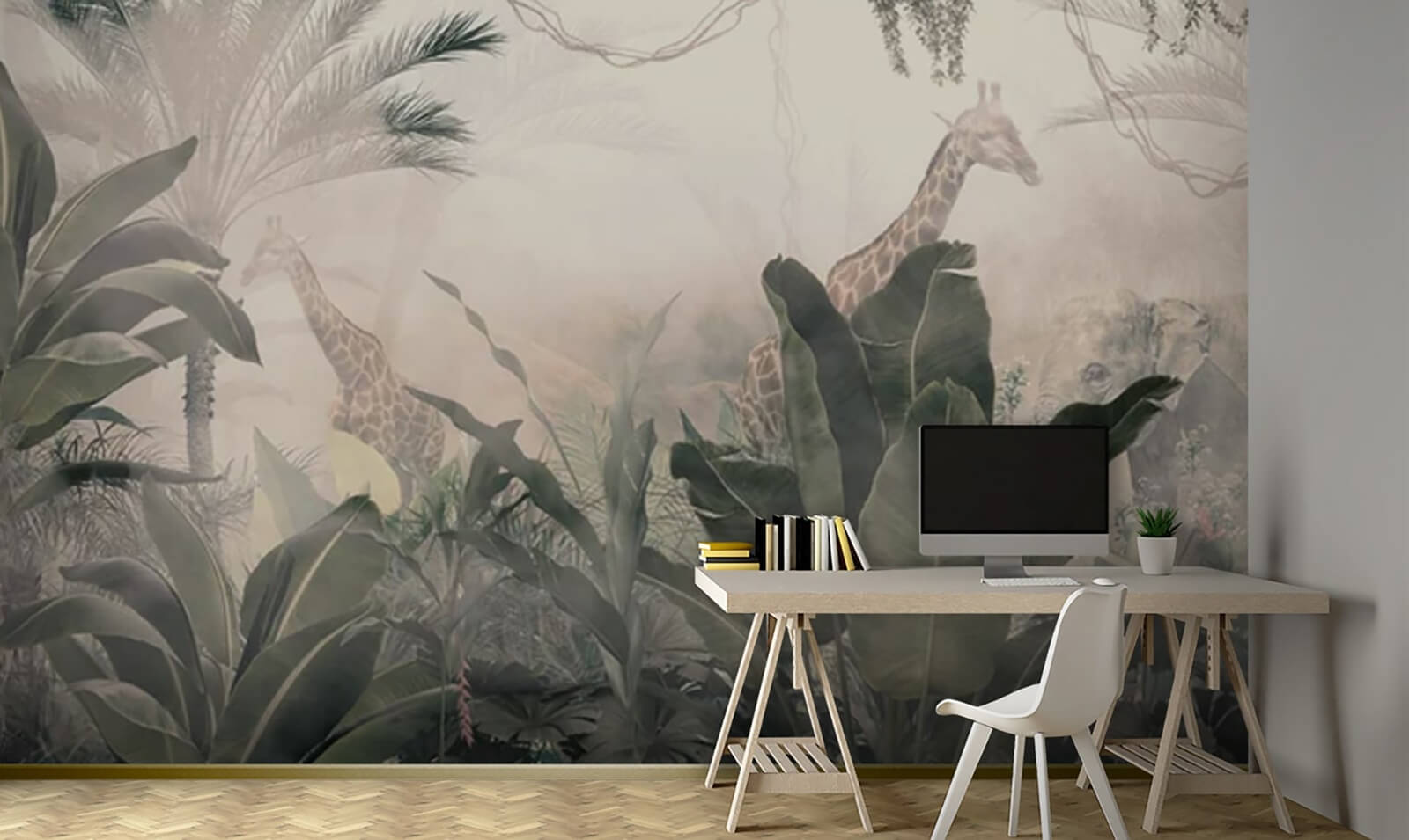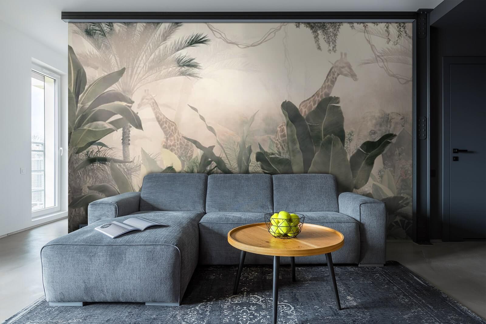 Verwandeln Sie Ihren Raum in einen märchenhaften Dschungel mit dieser Wandtapete, auf der anmutige Giraffen durch üppiges Grün spähen. Es ist, als würde man in einen Traum eintreten, in dem die Natur das Sagen hat. Stellen Sie sich vor: Sie trinken morgens Ihren Kaffee, die Sonne scheint herein und an Ihrer Wand steht eine ruhige Giraffe, die gemächlich Blätter frisst. Wer braucht da noch eine Safari? Die vielen Blätter schaffen eine gewisse Tiefe und lassen kleine Räume größer wirken. Das Wandbild ist ein toller Gesprächsaufhänger – Ihre Gäste werden bestimmt innehalten und es bewundern. Perfekt für Abenteuerlustige oder alle, die dem Alltag entfliehen möchten. Ein Hauch von Magie, direkt bei Ihnen zu Hause!