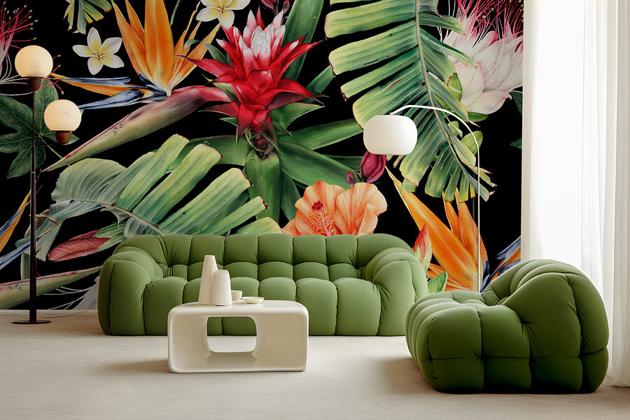 Verwandeln Sie Ihren Raum in ein tropisches Paradies mit dieser lebendigen Fototapete. Stellen Sie sich vor, Sie betreten einen Dschungel aus kräftigen Farben, in dem sich flammend rote Blüten mit üppigen Blättern mischen, und das alles vor einem schlichten schwarzen Hintergrund. Es ist, als ob Sie sich ein kleines Stück eines sonnenverwöhnten Urlaubs direkt in Ihr Wohnzimmer holen würden. Ihre Freunde werden denken, dass Sie ein Dekorationsprofi sind – oder vielleicht nur ein heimlicher Botaniker! Außerdem können die fröhlichen Blumen jede Stimmung heben und eine fröhliche, einladende Atmosphäre schaffen. Sie eignen sich perfekt für eine Akzentwand oder eine Stelle, die einen Hauch von Persönlichkeit braucht. Wer würde sich nicht gerne jeden Tag wie im Urlaub fühlen? Tauchen Sie ein in dieses lebendige Muster und beobachten Sie, wie Ihre Wände zum Leben erwachen!