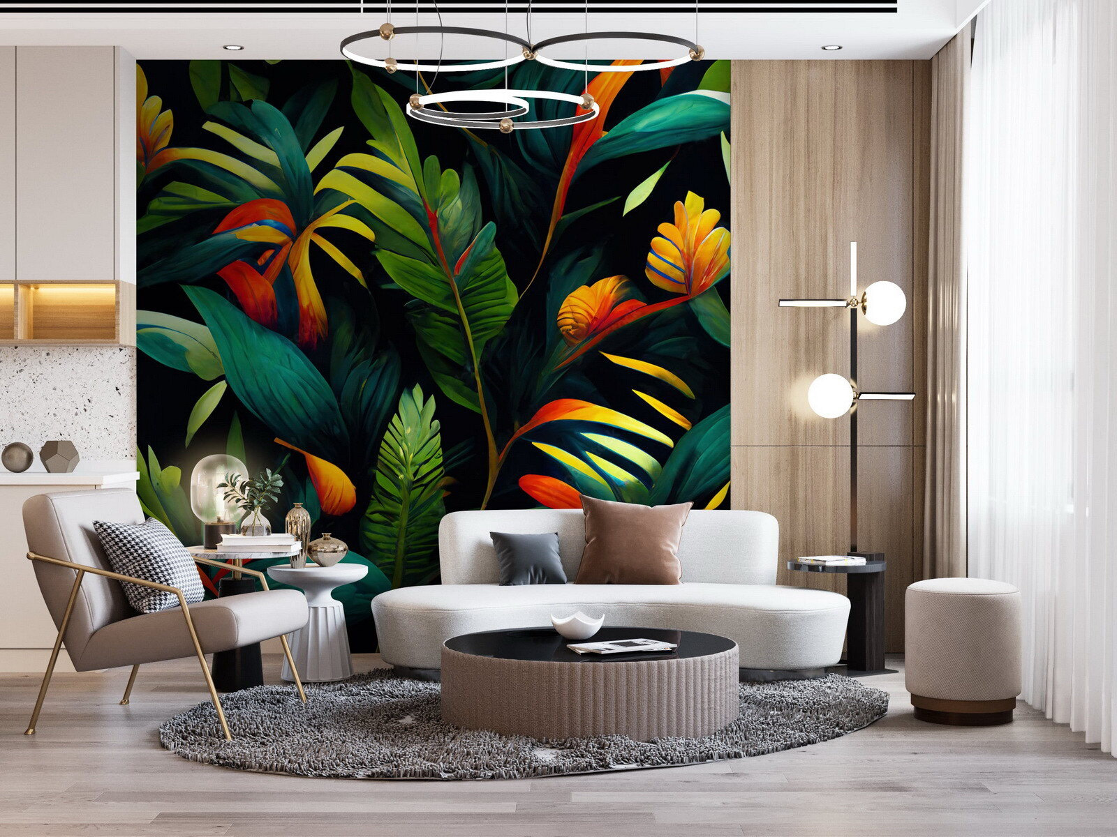Verwandeln Sie jeden Raum in eine tropische Oase mit diesen lebhaften Wandbildern. Stellen Sie sich vor, dass Sie jeden Tag in ein üppiges Paradies eintreten, wo das tiefe Grün und die warmen Farben Ihnen das Gefühl geben, dass Sie sich ständig im Urlaub befinden. Die verspielte Mischung aus Blättern und Blumen bringt Leben und Energie an Ihre Wände und schafft eine fröhliche Atmosphäre, die sogar den Montagmorgen heller erscheinen lässt. Gäste werden sich nur schwer auf ein Gespräch konzentrieren können, wenn sie sich in diesem botanischen Wunderland verlieren. Es eignet sich perfekt für ein gemütliches Wohnzimmer oder ein lebhaftes Büro und ist wie ein kleines Stück Natur in Ihrem Zuhause. Genießen Sie die Freude am Leben in voller Blüte.