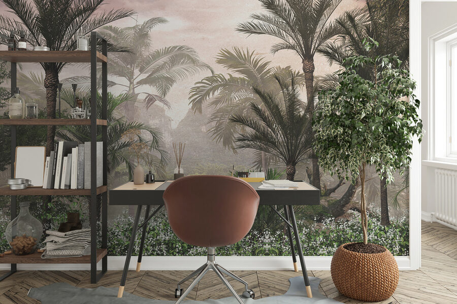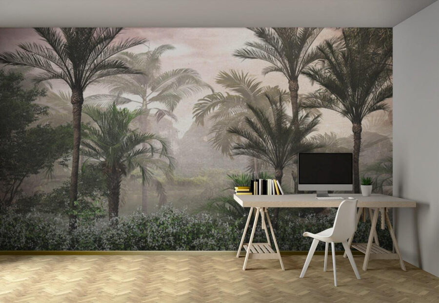 Fototapete “Gelassener Morgen im tropischen Paradies” – ist dieser Name nicht einladend? Stellen Sie sich vor, Sie wachen mit dieser friedlichen Szene auf, direkt in Ihrem Wohnzimmer. Kräftige Grüntöne, zarte Blüten und hoch aufragende Palmen, die in einen sanften Morgennebel gehüllt sind. Es ist, als würden Sie Ihren eigenen Dschungel betreten, ohne Ihre Couch zu verlassen.