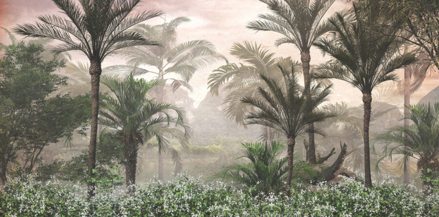 Fototapete “Gelassener Morgen im tropischen Paradies” – ist dieser Name nicht einladend? Stellen Sie sich vor, Sie wachen mit dieser friedlichen Szene auf, direkt in Ihrem Wohnzimmer. Kräftige Grüntöne, zarte Blüten und hoch aufragende Palmen, die in einen sanften Morgennebel gehüllt sind. Es ist, als würden Sie Ihren eigenen Dschungel betreten, ohne Ihre Couch zu verlassen.