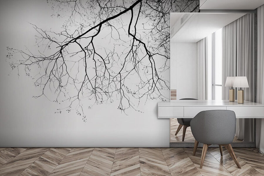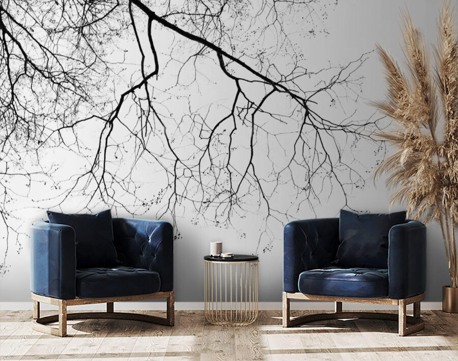 Möchten Sie Ihrem Raum einen Hauch von Natur verleihen, ohne dass Sie sich mit herabfallenden Blättern herumschlagen müssen? Dann sehen Sie sich diese atemberaubende Fototapete mit kahlen Ästen an, die verschlungene Muster bilden. Es ist, als ob Sie die Ruhe eines verschneiten Hains direkt in Ihr Wohnzimmer bringen würden. Die Wandtapete ist einfach zu betrachten und voller subtiler Dramatik. Sie wirkt wie ein in der Zeit eingefrorener Moment, von dem man insgeheim hofft, dass er sich in einen Baumgeist verwandeln möge.