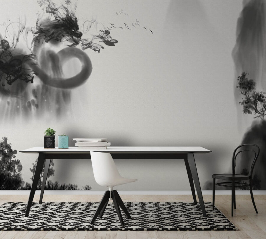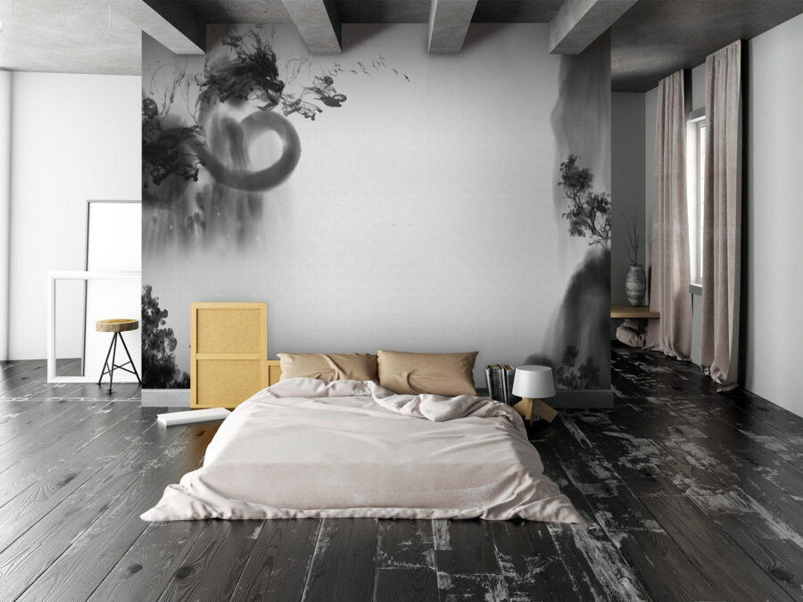 Sehen Sie sich diese coole Wandmalerei in Schwarz und Weiß an! Es ist eine Mischung aus klassisch und künstlerisch. Stell dir vor, du betrittst einen Raum und wirst von dieser geheimnisvollen, fast verträumten Szene begrüßt. Es sieht aus wie rauchige Tinte, die auf dem Papier herumwirbelt, mit Anklängen an Landschaften und abstrakte Formen, die sich vermischen.