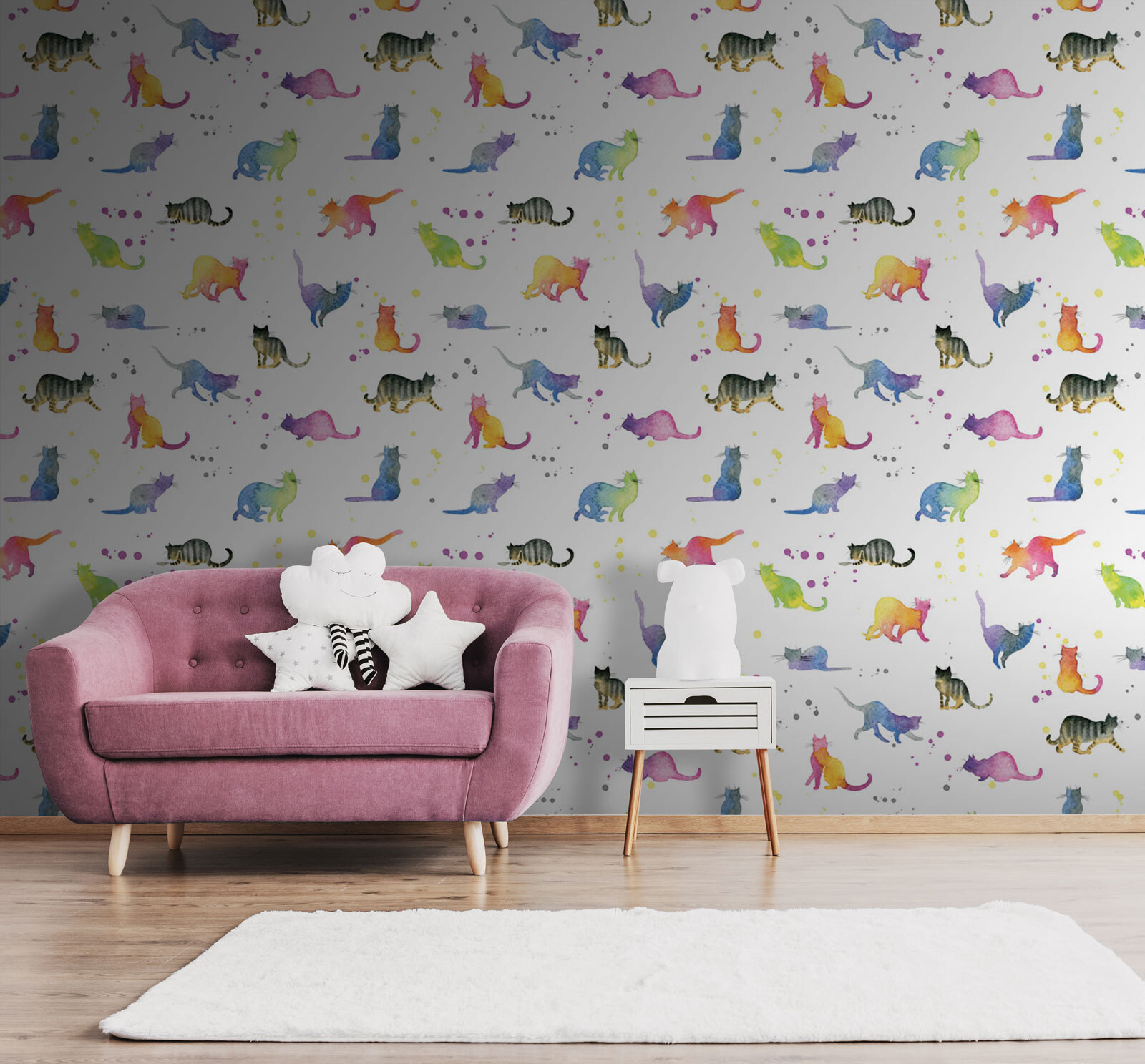 Verwandeln Sie jede Wand in einen fantasievollen Dschungel aus Aquarellkatzen, der selbst die mürrischsten Katzen zum Schnurren bringt! Diese Wandtapete strotzt nur so vor Farben und Katzencharme und kombiniert verspielte Schnurrhaare mit koketten Schwänzen. Stellen Sie sich vor, Sie betreten einen Raum, in dem Sie mit jedem Blick einen neuen Katzenfreund entdecken, der bereit ist, Ihren Tag zu verschönern. Die Mischung aus sanften Farbtönen strahlt Ruhe aus und eignet sich perfekt für eine gemütliche Leseecke oder ein originelles Kinderzimmer. Es ist, als würde man täglich mit Kätzchen kuscheln – ganz ohne Katzentoilette! Egal, ob Sie Katzenliebhaber sind oder einfach nur Spaß an ausgefallener Dekoration haben, diese Tapete wird jeden begeistern, der vorbeikommt.
