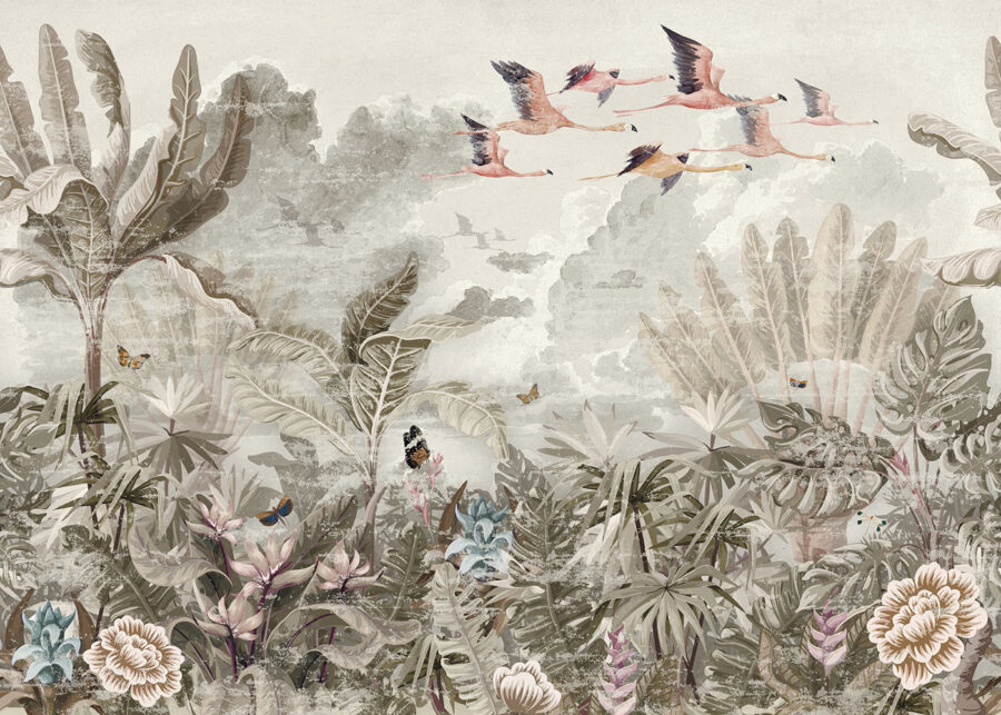 Haben Sie sich jemals vorgestellt, dass Flamingos über einen üppigen, grünen Dschungel gleiten? Dieses Wandgemälde macht es möglich. Die Farben sind subtil und doch eindrucksvoll, wie ein kühler Morgen nach einem Nieselregen. Diese rosafarbenen Flamingos – sind sie nicht einfach ein Hauch von Magie? Sie vermitteln ein Gefühl von Freiheit und Anmut und schweben über Palmenblättern und wilder Flora. Jedes Mal, wenn man den Raum betritt, ist es, als würde man in ein exotisches Wunderland eintauchen. Perfekt, um einen Hauch von Abenteuer und Ruhe in Ihren Raum zu bringen, finden Sie nicht auch? Diese Fototapete hat die perfekte Mischung aus Wildheit und Gelassenheit, die sich einfach… richtig anfühlt. Man kann mit Sicherheit sagen, dass es ein echter Gesprächsanlass ist!