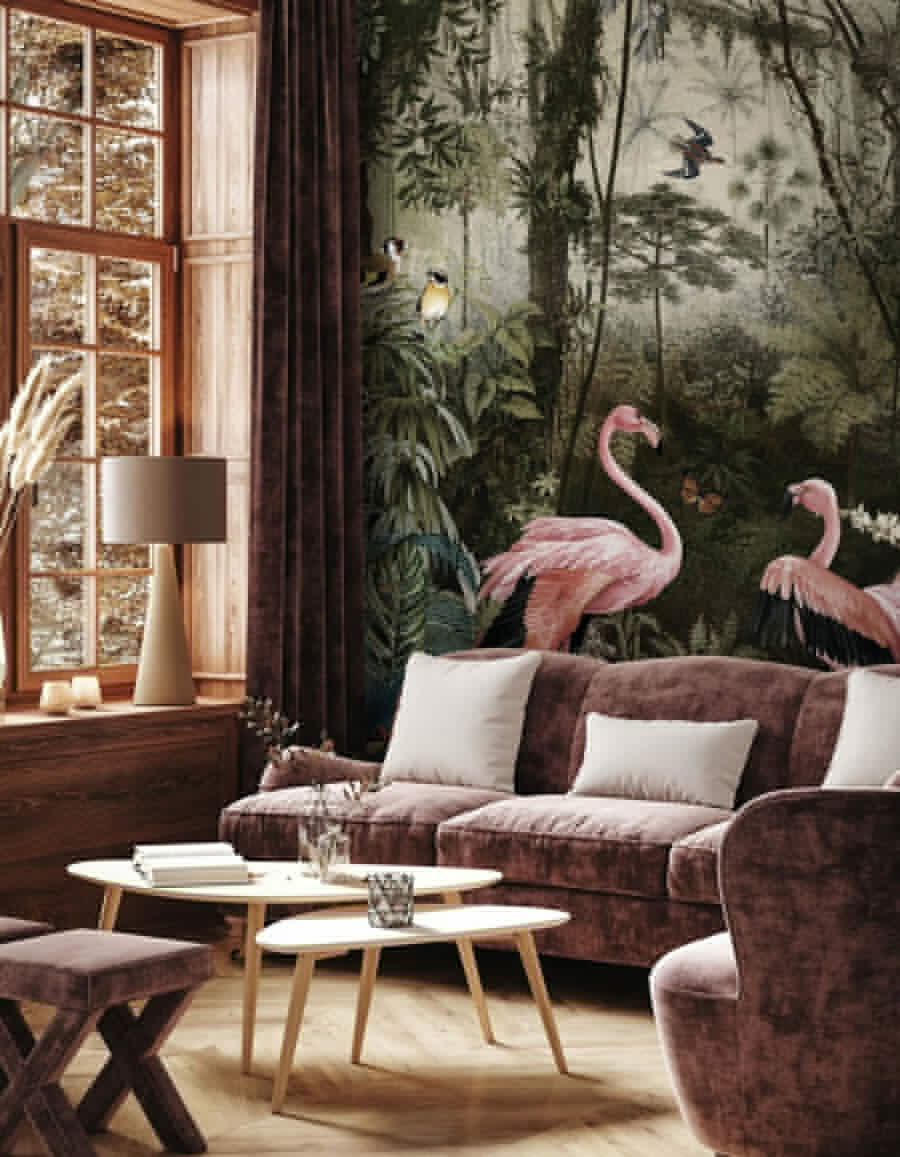 Stellen Sie sich vor, Sie betreten einen üppigen Dschungel mit der anmutigen Präsenz von Flamingos – das ist es, was diese Fototapete in Ihren Raum bringt. Perfekt, um ein einzigartiges Flair zu schaffen, ist es, als hätte man ein kleines Stück exotisches Paradies direkt an der Wand. Die leuchtenden Rosatöne der Flamingos heben sich von den tiefen Grüntönen des Dschungels ab. Es ist so detailliert, dass Sie sich bei jedem Blick auf das Bild wie auf einer Expedition fühlen werden. Ideal für alle, die sich nach einem Hauch von Abenteuer in ihrer Einrichtung sehnen. Mal ehrlich, wer könnte diesen charmanten Flamingos widerstehen? Man könnte meinen, sie stolziert heraus und setzt sich zu Ihnen zum Tee!