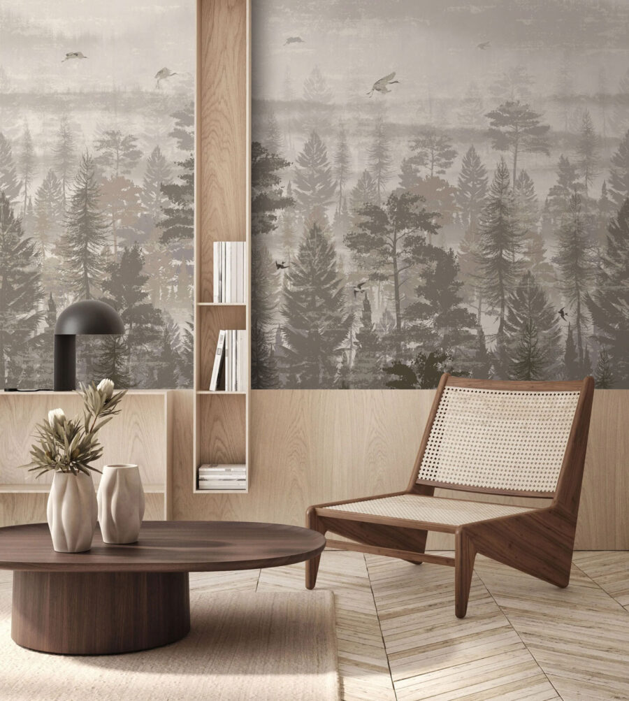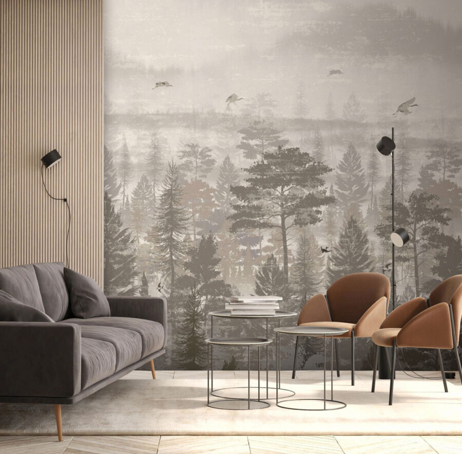 Verwandeln Sie Ihren Raum mit diesem atemberaubenden Wandbild von Vögeln, die über einen ruhigen Wald fliegen. Es ist, als hätten Sie ein Stück Natur direkt in Ihrem Wohnzimmer – natürlich ohne die Mücken. Die sanften, gedeckten Farben strahlen eine beruhigende Atmosphäre aus und bilden den perfekten Hintergrund für gemütliche Momente, egal ob Sie Kaffee trinken oder in ein gutes Buch eintauchen. Stellen Sie sich vor, Sie wachen mit diesem ruhigen Anblick auf, bei dem jeder Blick wie eine kleine Flucht in den Wald wirkt. Es ist genau das Richtige für diejenigen, die einen Hauch von Abenteuer gemischt mit einem Spritzer Eleganz lieben. Perfekt für jeden Naturliebhaber oder jeden, der bereit ist, seine Einrichtung aufzuwerten!